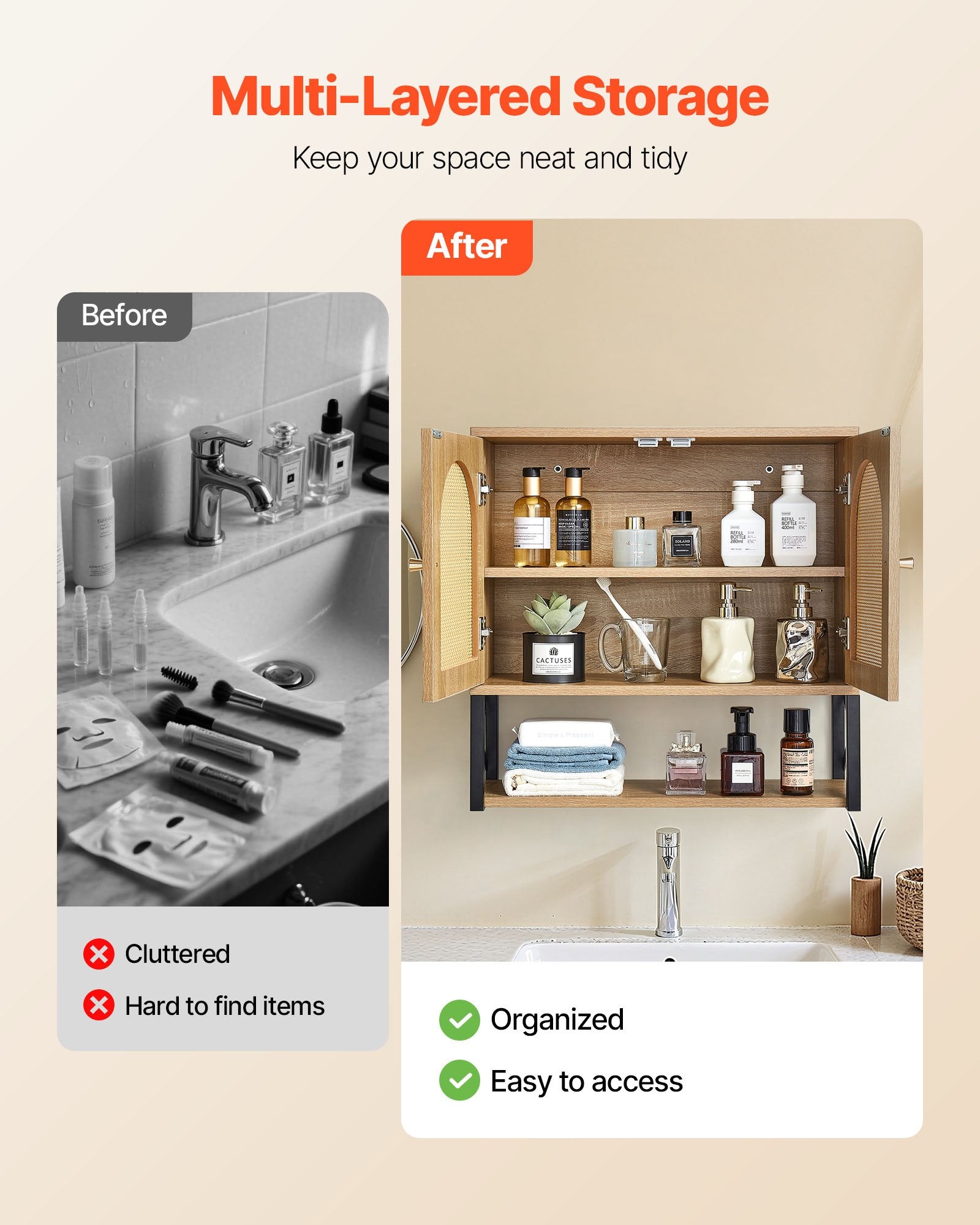 - Multi-Layer Classified Storage: Scientific storage partitions clarify item classification. This hanging bathroom cabinet features a thoughtful layered design. It accommodates bottles and cans of all sizes, you can take and put away without clutter