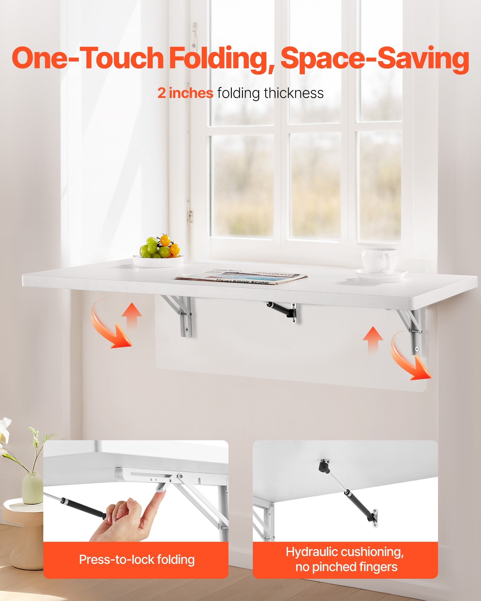 - Slow-Closing Folding: Designed to save space, this wall mounted folding table folds and unfolds quickly, ideal for small spaces. The slow-closing brackets prevent pinching during use, making it ultra-convenient for immediate use without the need for large reserved spaces—just unfold and start working or display items.