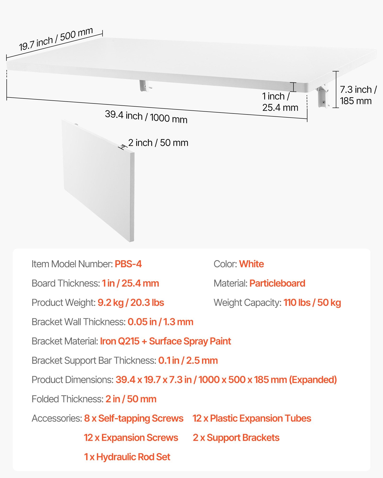 Wall Mounted Folding Table, 39.4 x 19.7 inches Wall Mount Table, Floating Desk with Iron Bracket, Fold Down Desk for Small Spaces, Home Office, Dining, Laundry Room, Kitchen, Bar, White