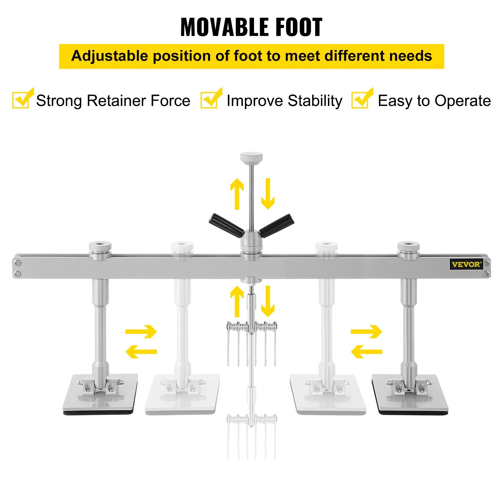 - Adjustable Foot: You can adjust the position of foot to meet different needs in different situations. Adjust the width of the feet flexibly to match the position of the dents for better support, and the bottom two footers will give you greater stability and support. Besides, you can rotate the black knob to easily control and pull out the auto body dent puller lever bar stably by yourself.