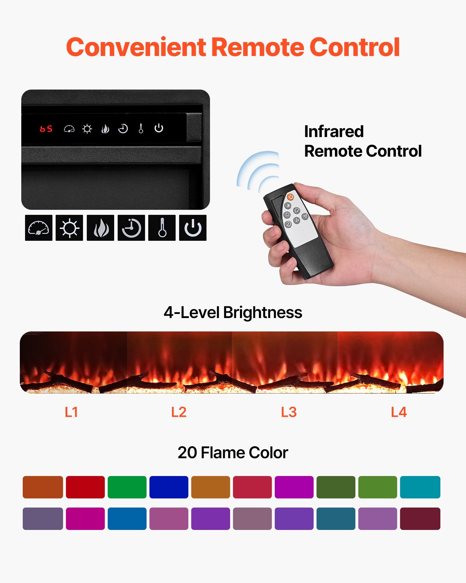 - Effortless Control: Adjust the ambiance in your room effortlessly with this fireplace for living room. The infrared remote allows you to control the temperature, flame brightness, and select from 20 flame colors. Plus, set the timer for up to 9 hours, ideal for movie nights without hassle