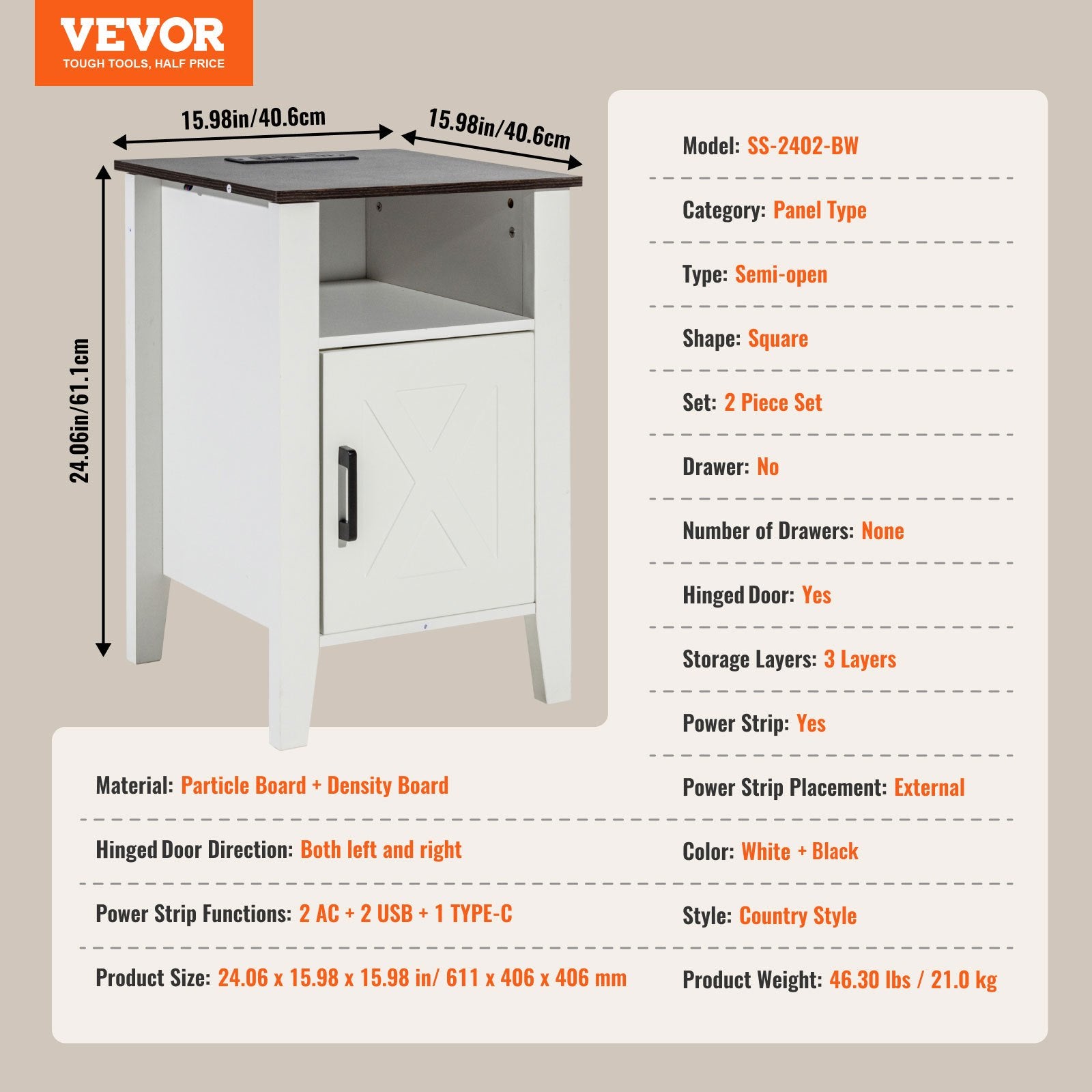 Farmhouse End Table Set of 2, Nightstand with Charging Station, 3 Tiers Side Table with Storage Cabinet, End Table with USB Ports and Outlets, Ideal for Living Room, Bedroom, Office, White