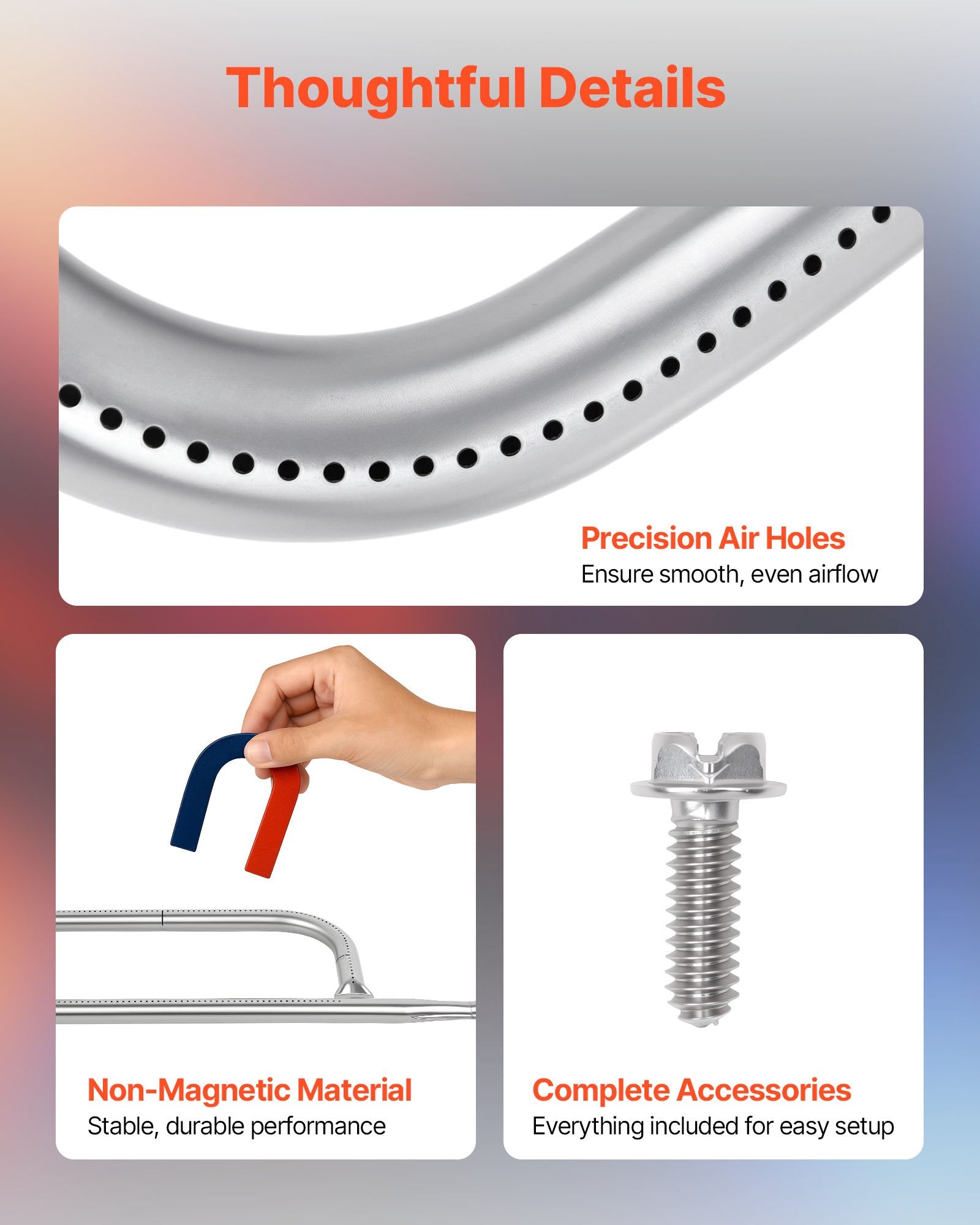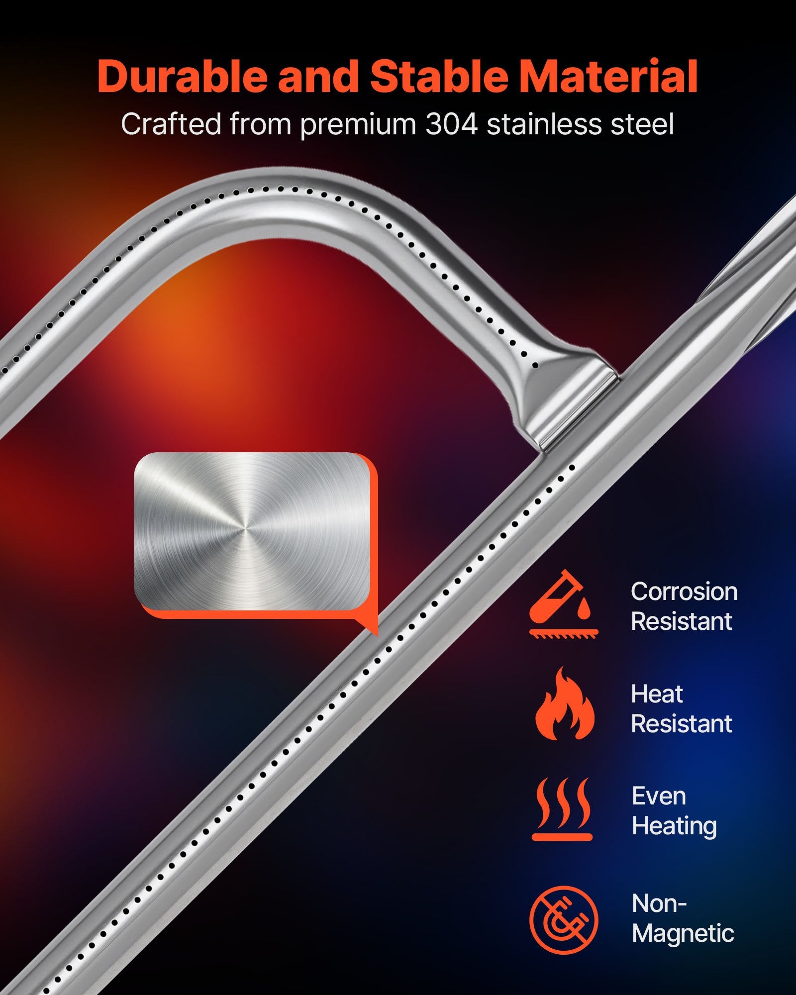 - Consistent Air Supply: VEVOR grill burner tube pipe part features precisely spaced gas ports that help deliver balanced airflow and consistent flames. It helps avoid uneven heating and supports reliable cooking across the entire grill, whether you're searing steaks or grilling vegetables