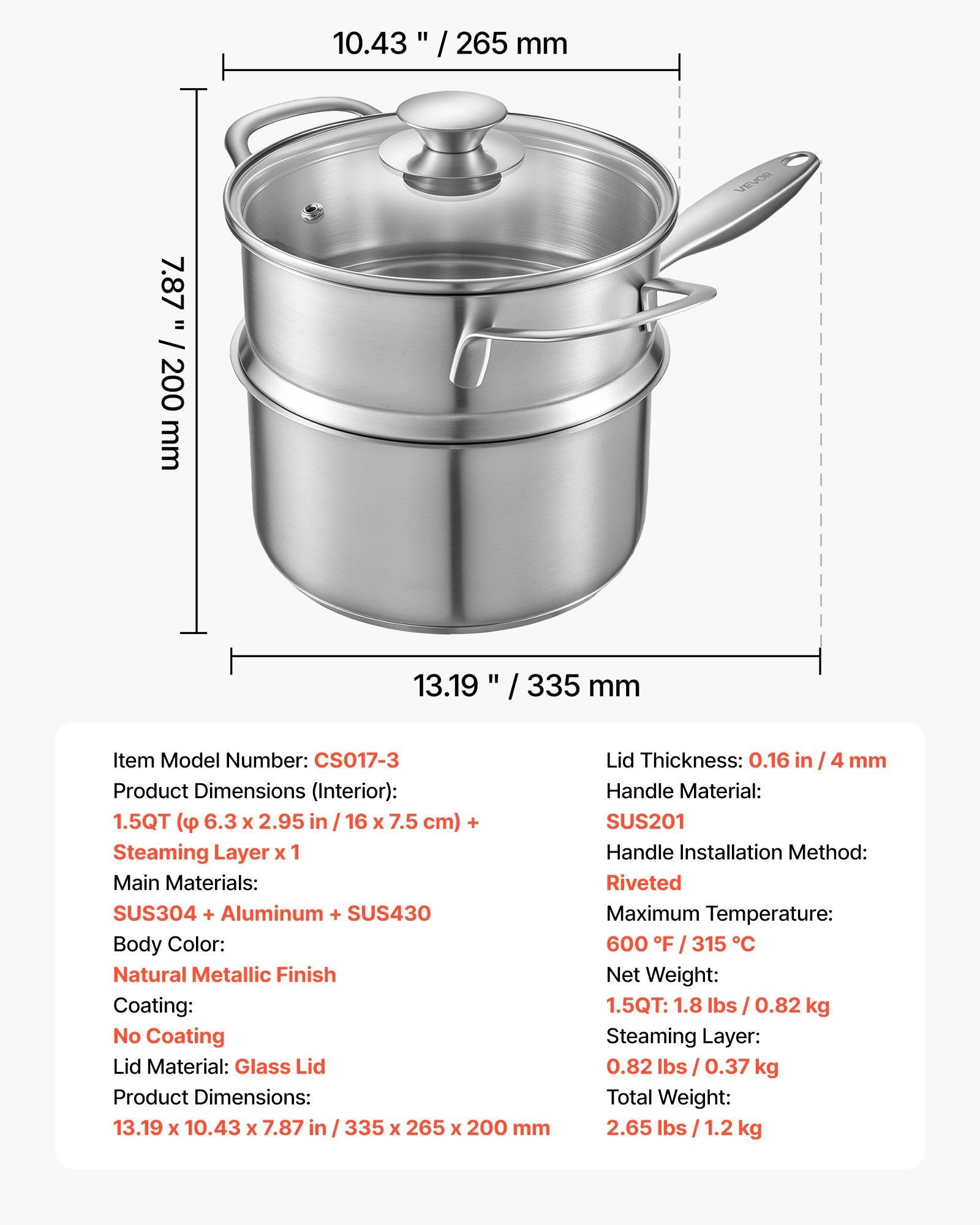 - 2-in-1 Saucepan with Steamer: This 1.5QT saucepan comes with a steamer insert, making it ideal not only for cooking sauces, soups, and milk, but also for steaming seafood and vegetables. A versatile solution for everyday meals