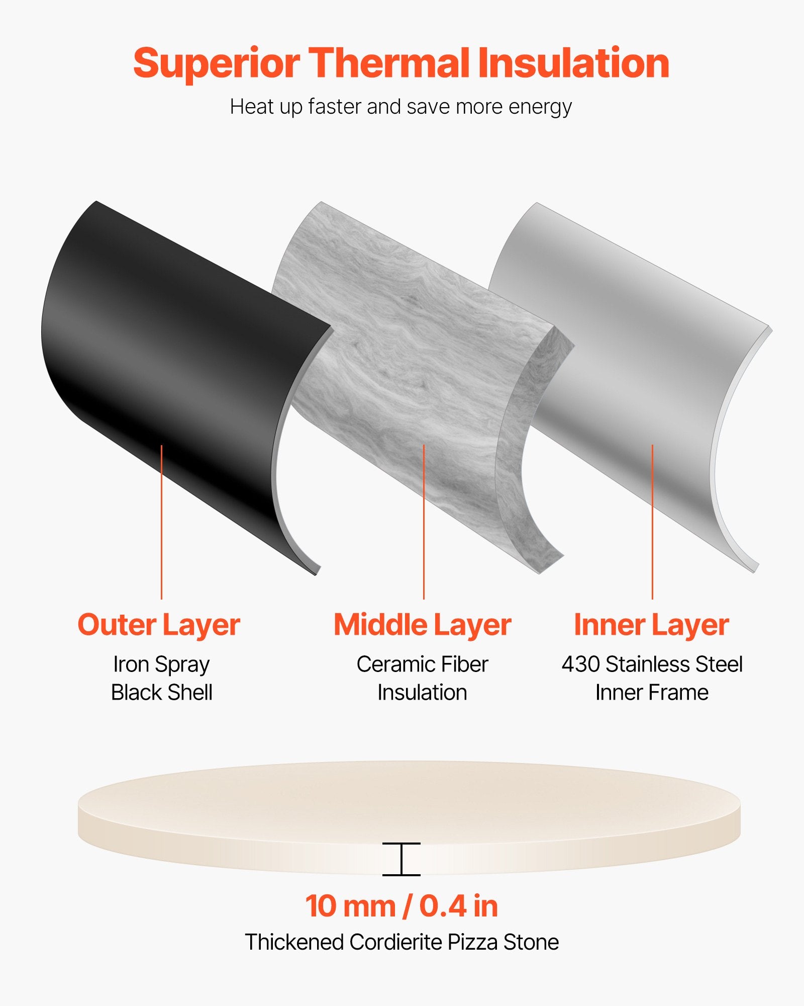 - Durable Construction: VEVOR multi-fuel pizza oven withstands outdoor conditions and frequent use. Adopted a 3-layer design, promoting efficient heat circulation. Featuring a iron spray black shell, and thick insulation cotton, it ensures durability and excellent heat retention