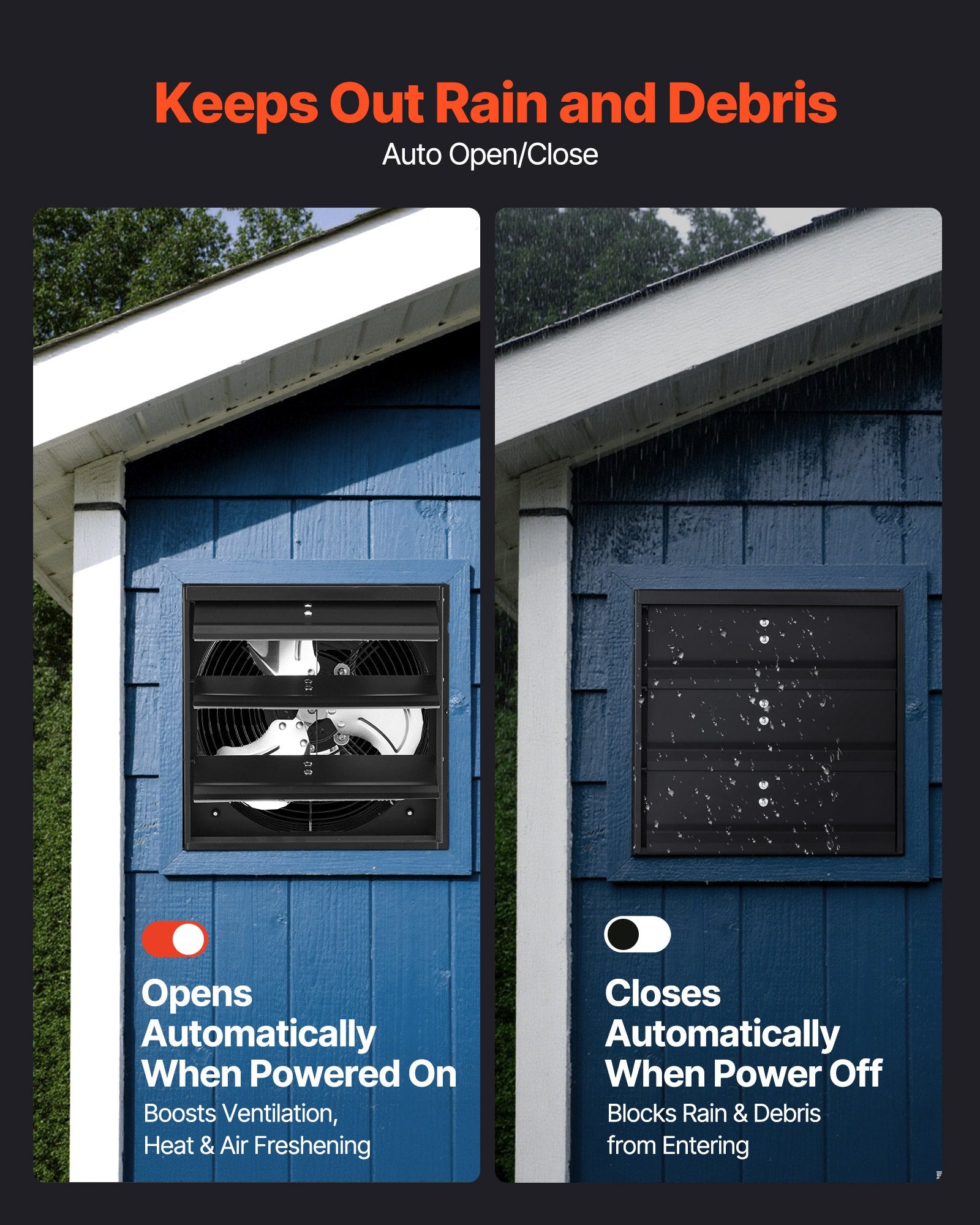 - Rain Guard: Shutters open when powered for ventilation and deodorizing, then close when off to block rain and small things, reliable protection for an attic exhaust fan setup