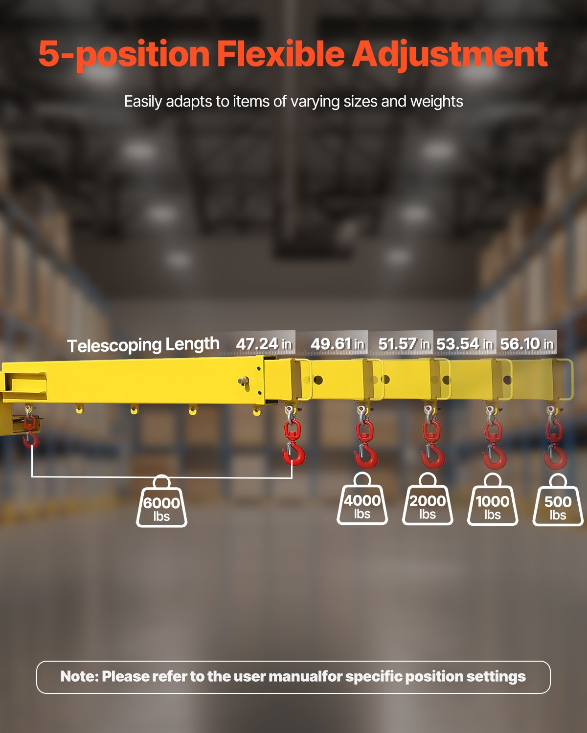 - Multi-Position Adjustment: you can easily adjust the boom length of the forklift mobile crane (up to 56.1 inches) and load capacity (up to 6000 lbs) based on actual needs, enabling precise and efficient lifting operations.