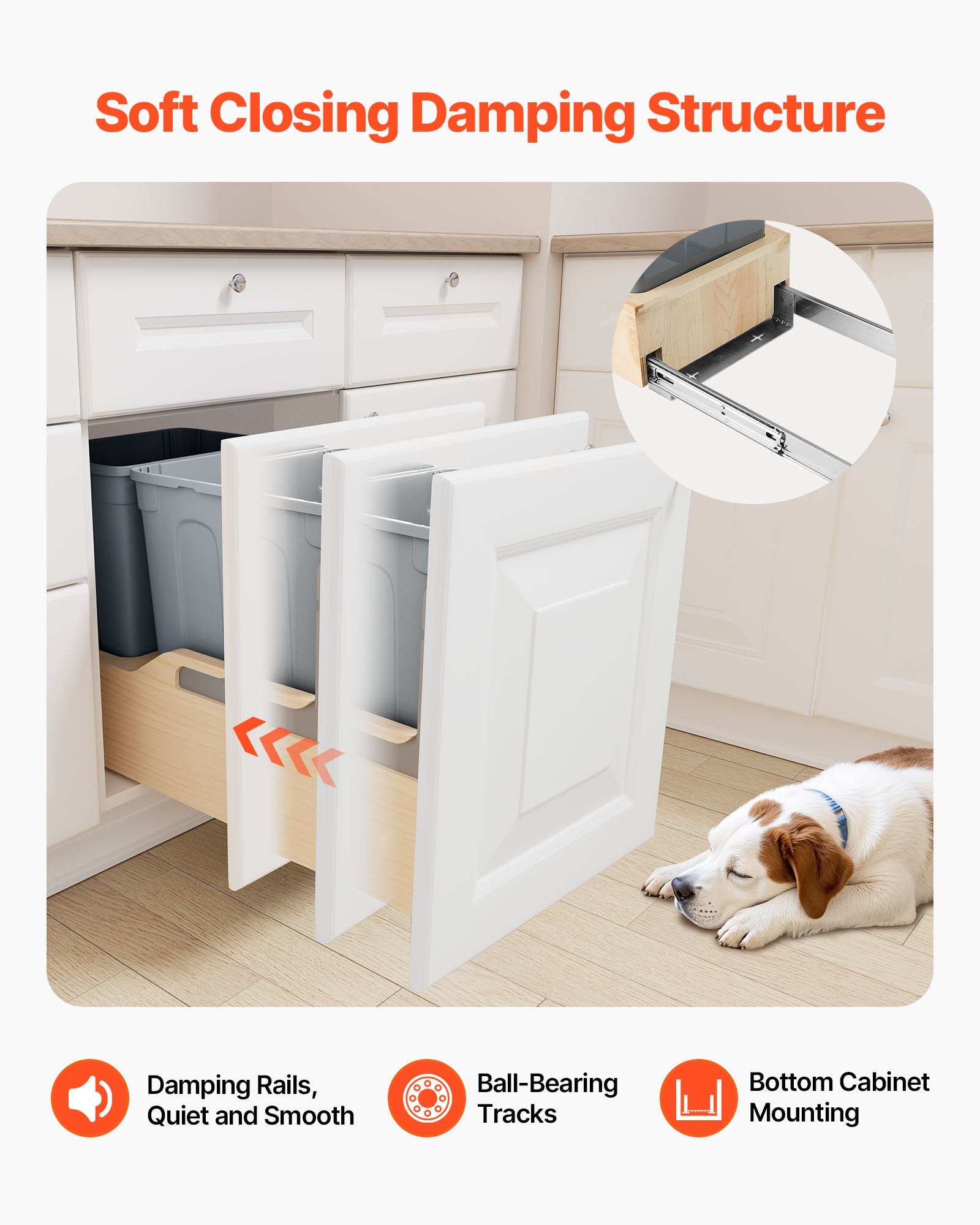 - Soft-Close System: The under counter trash can features high-quality damping rails with soft-close technology, allowing you to smoothly and quietly slide the bin in and out. There's no need to constantly adjust the bin, making trash disposal easy and comfortable. The bracket is made of iron, offering strong rust and corrosion resistance and can be wiped clean for long-lasting durability
