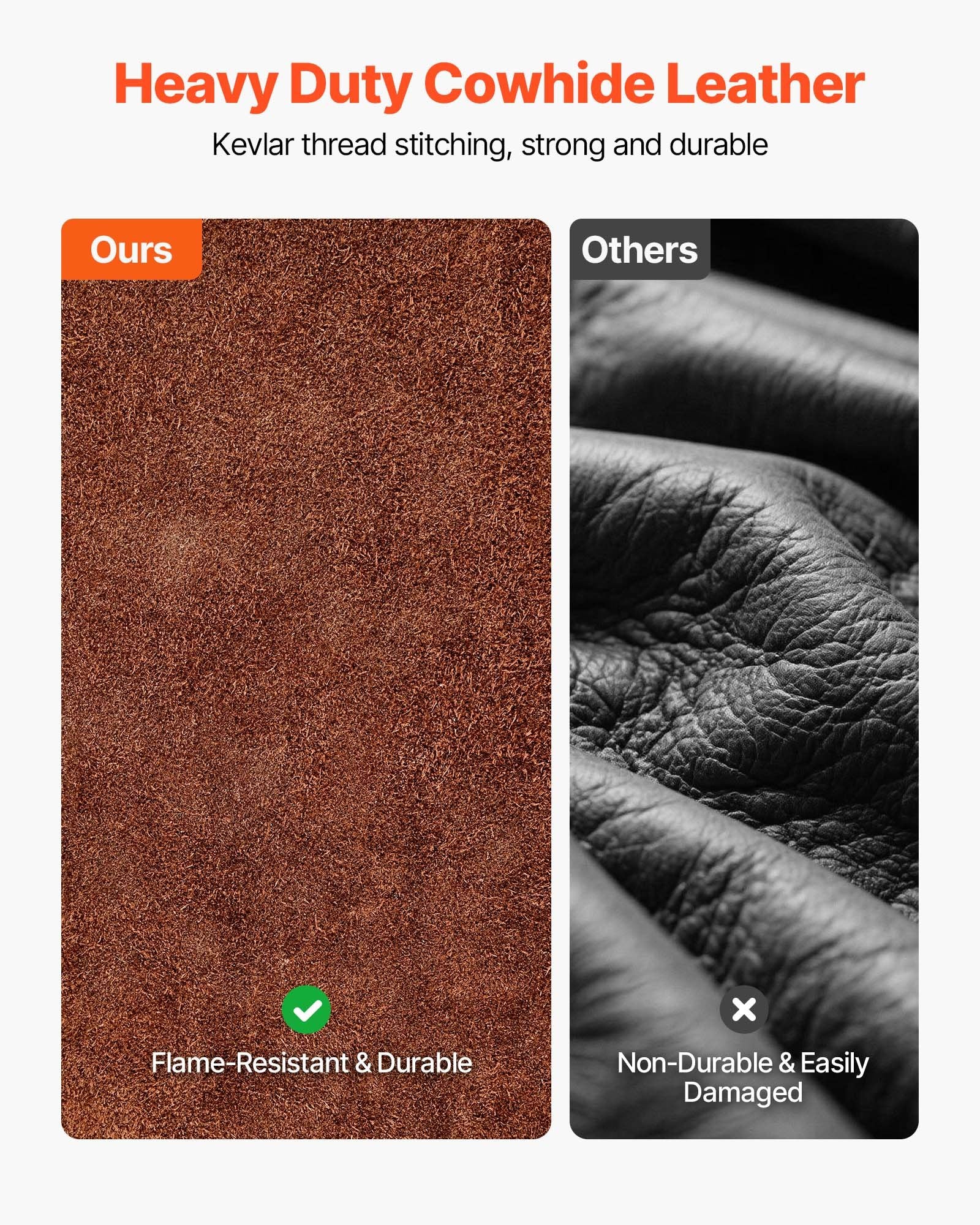 - Heavy Duty Leather: Crafted from heavy-duty full cowhide leather, and sewn with strong, flame-resistant Kevlar thread, VEVOR welding work apron ensures high durability and reliable protection, protecting you from sparks, flames, heat and fire hazards