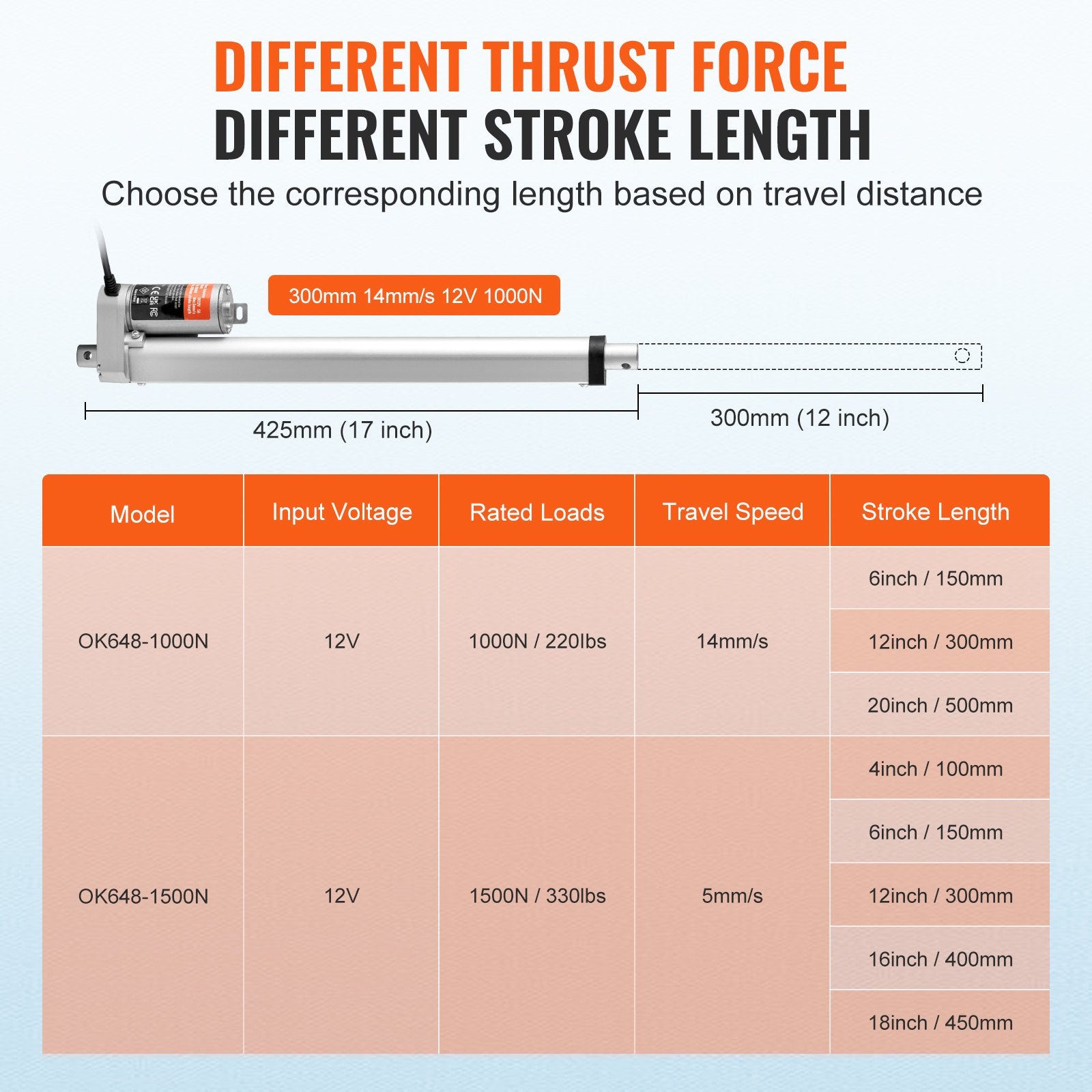 - Fast & Efficient Stroke Adjustment: Lift or lower effortlessly with VEVOR linear actuator, moving at a swift 0.55"/s. Perfect for applications requiring frequent height adjustments, whether it's altering furniture heights or raising and lowering office desks and chairs.