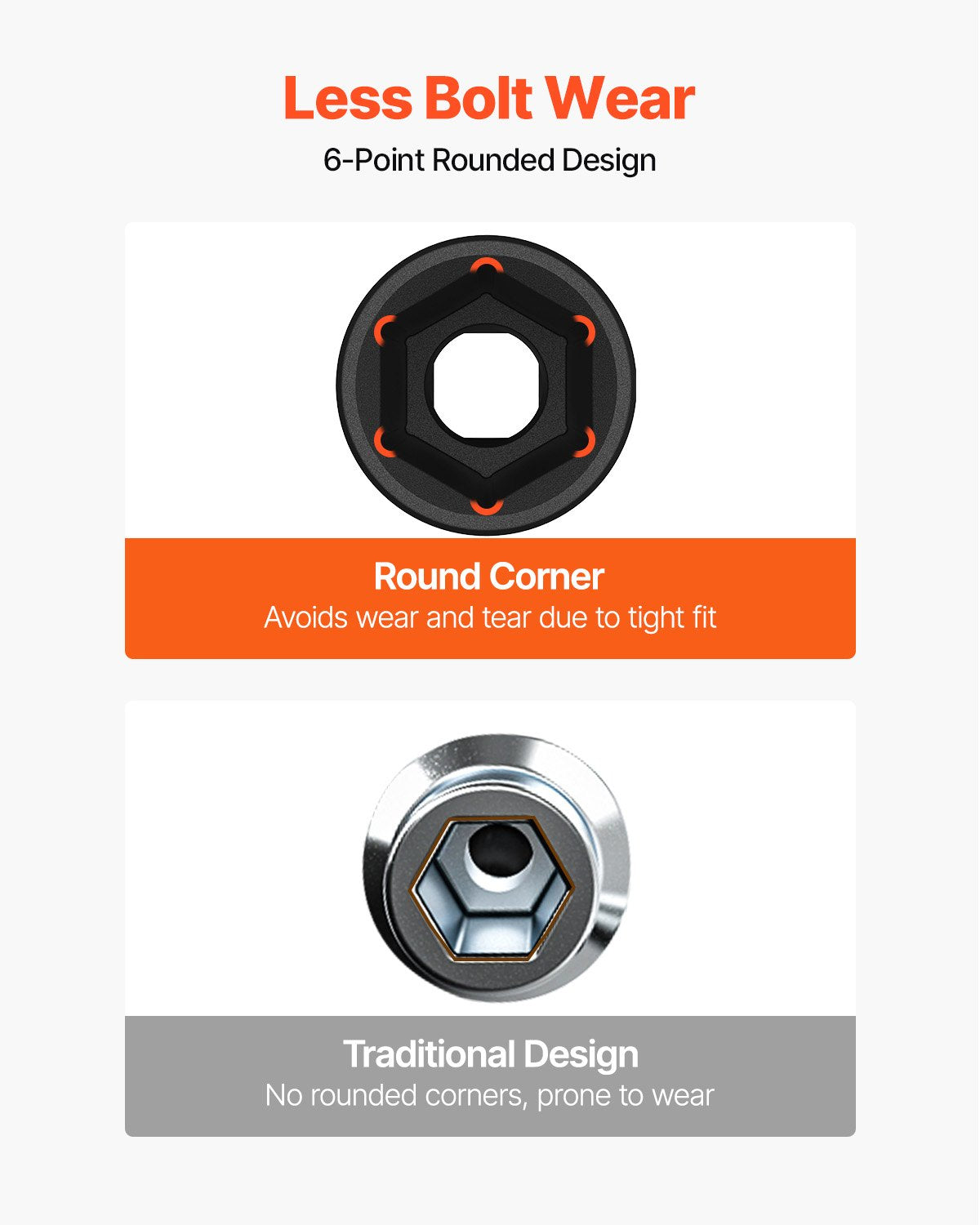 - 【SUPERIOR PERFORMANCE】- Whether you drive them with an impact wrench or by hand, these premium chrome vanadium sockets deliver superior performance. The impact socket set features a 6-point, high-torque design that contacts and grips the stronger flat sides of the nut or bolt head, not the weaker corners.