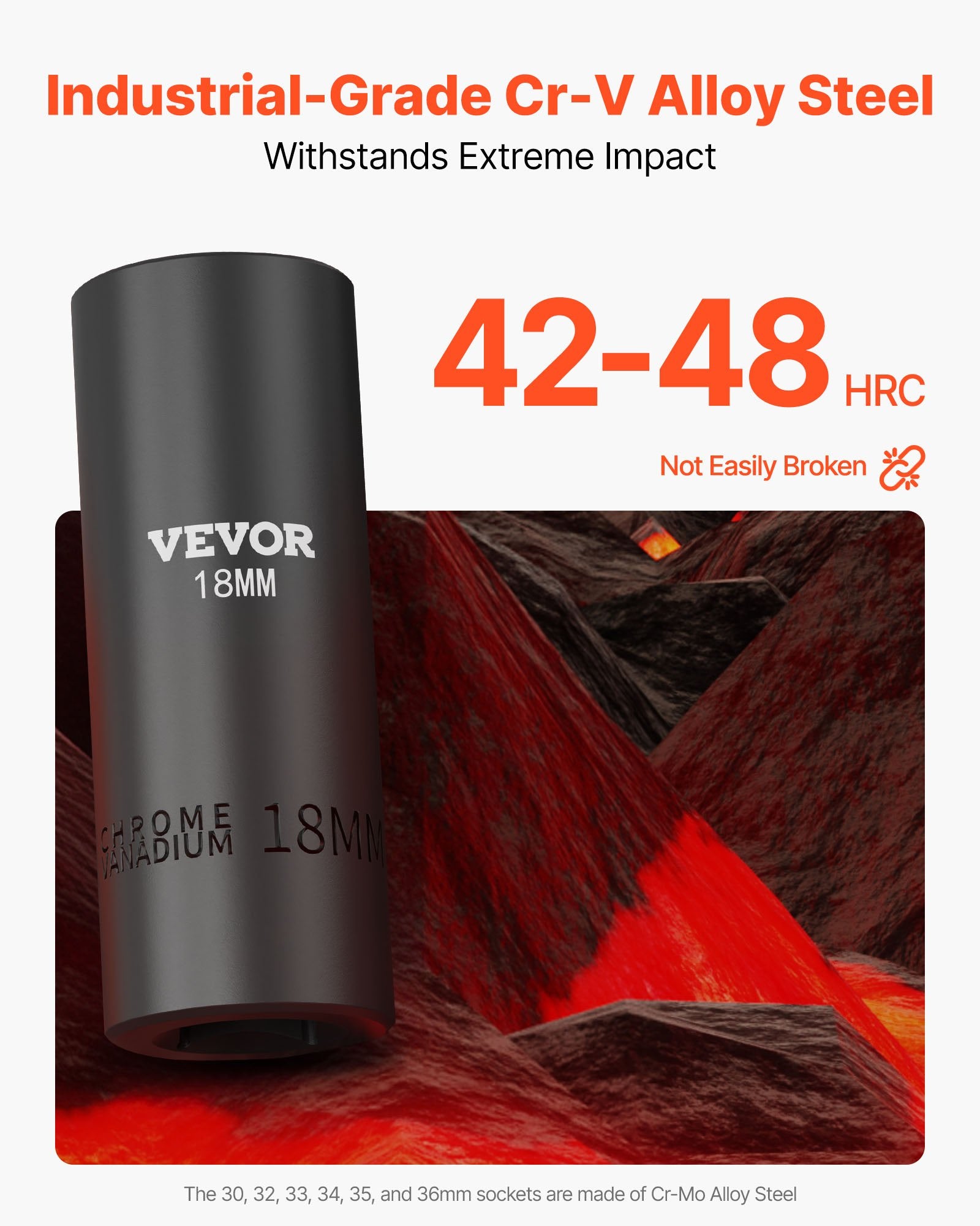 - Rugged Construction: VEVOR 1/2 inches drive impact socket set is made from CR-V and Cr-Mo industrial-grade alloy steel, heat-treated with an HRC 42-48 hardness for superior impact resistance and high torque, ideal for heavy-duty mechanical tasks like auto repairs (The 30mm to 36mm sockets are made of Cr-Mo Alloy Steel)