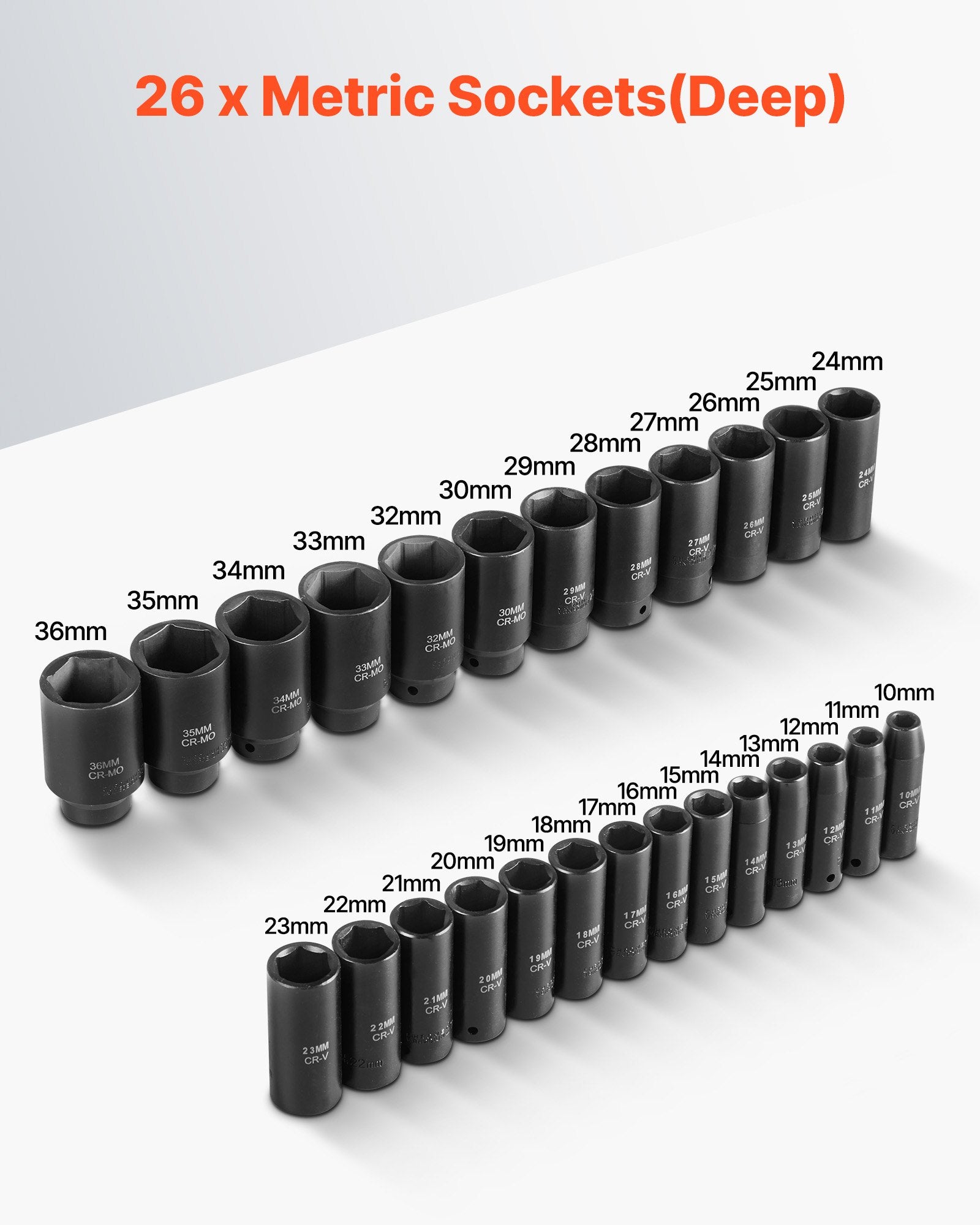 - 26-Piece Impact Socket Set: Includes 26 piece deep metric sockets: 10mm, 11mm, 12mm, 13mm, 14mm, 15mm, 16mm, 17mm, 18mm, 19mm, 20mm, 21mm, 22mm, 23mm, 24mm, 25mm, 26mm, 27mm, 28mm, 29mm, 30mm, 32mm, 33mm, 34mm, 35mm, 36mm