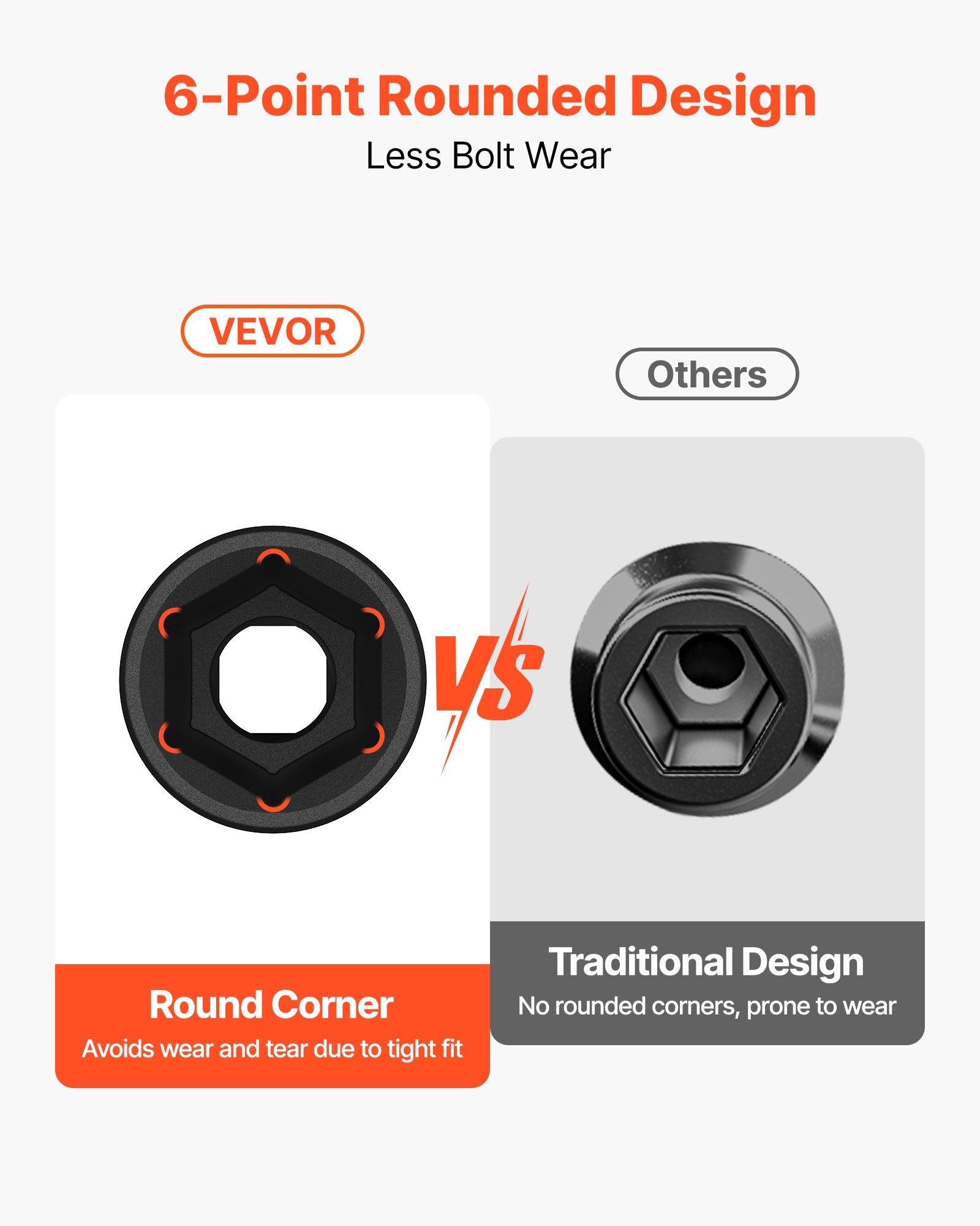 - High Torque: The 6-point hexagonal drive design ensures efficient impact handling, reducing pressure on fasteners and minimizing wear. It effectively prevents bolt rounding and stripping, offering superior durability compared to traditional drive designs