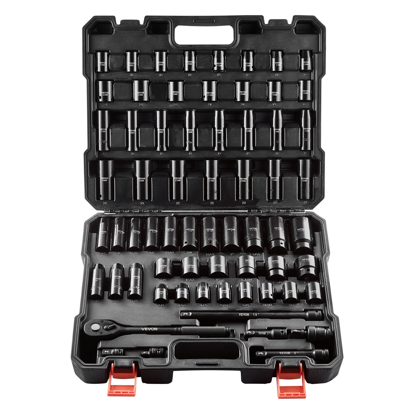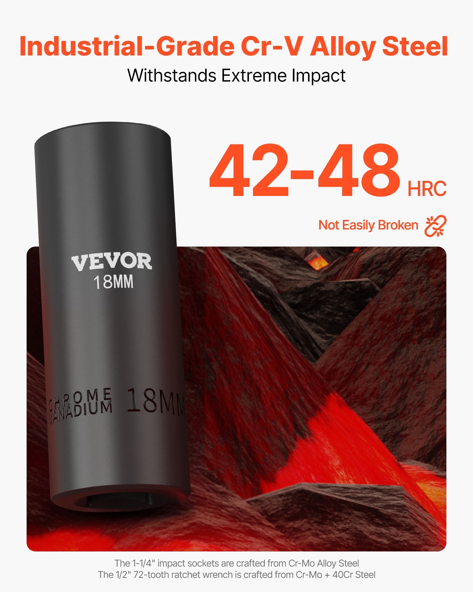 - Rugged Construction: VEVOR 1/2 inches drive impact socket set is made from CR-V and Cr-Mo industrial-grade alloy steel, heat-treated with an HRC 42-48 hardness for superior impact resistance and high torque, ideal for heavy-duty mechanical tasks. (The 1-1/4" socket is Cr-Mo steel, and the 1/2" ratchet wrench is made of Cr-Mo + 40Cr steel)
