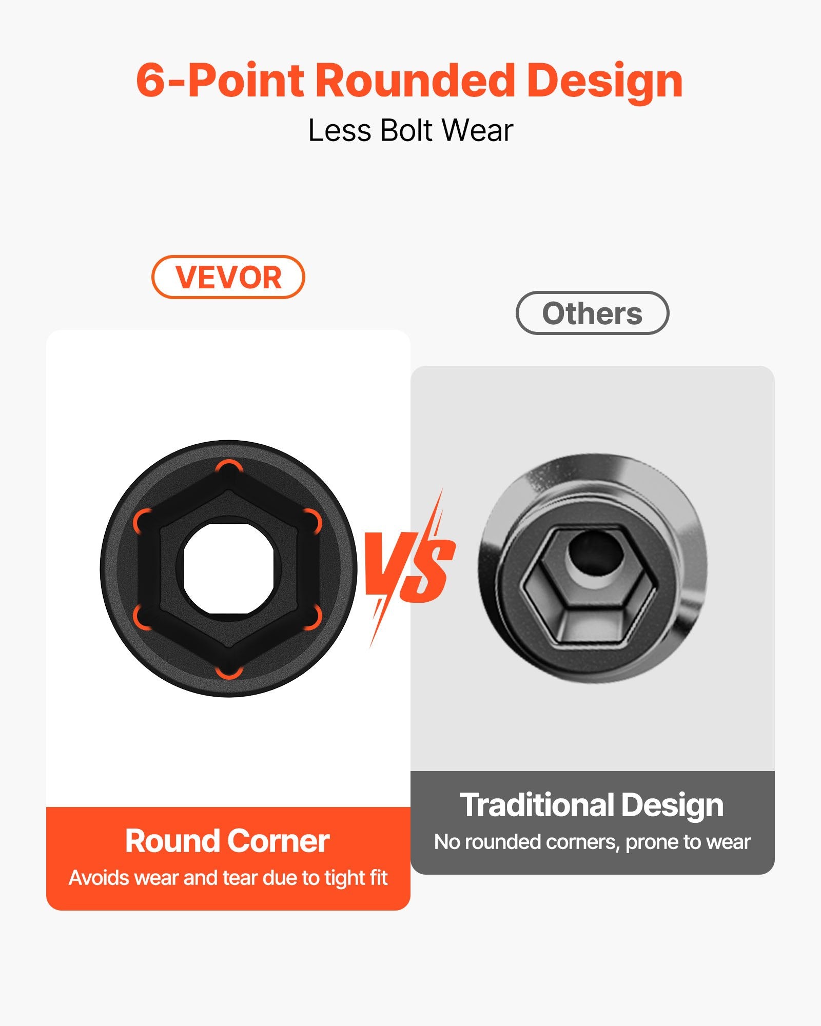 - High Torque: The 6-point hexagonal drive design ensures efficient impact handling, reducing pressure on fasteners and minimizing wear. It effectively prevents bolt rounding and stripping, offering superior durability compared to traditional drive designs