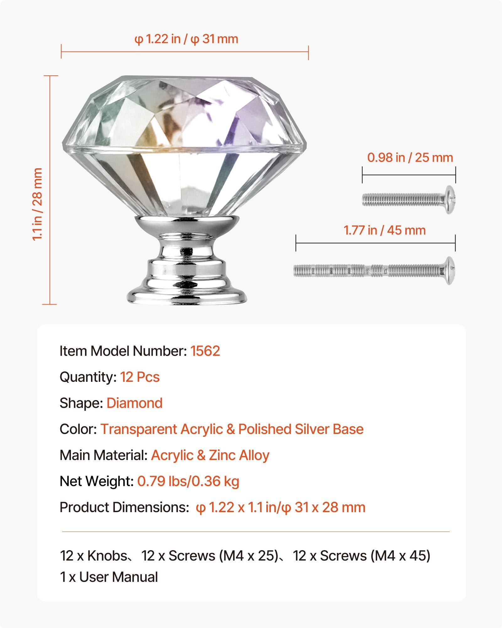 Cabinet Knobs, 12 Pack, 1.22 Inch Acrylic & Zinc Alloy Drawer Pulls Door Handles, Diamond Kitchen Solid Knobs Dresser Handles, Cupboard Hardware with Screws for Bathroom Closet Cabinets Drawers