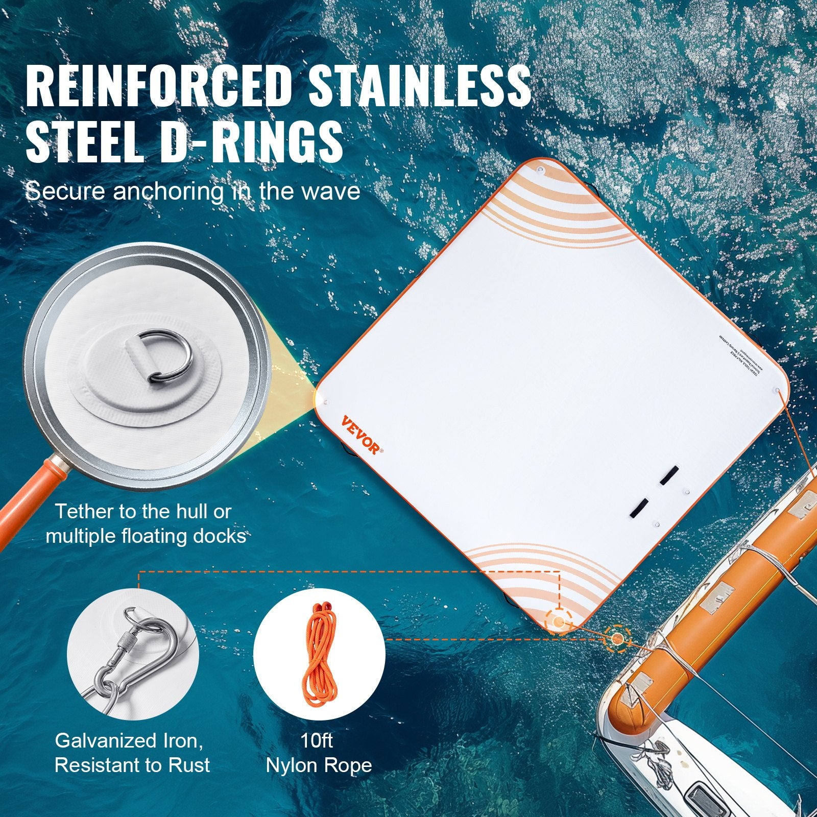 - Secure Anchoring, Happy Playtime: Stay anchored in peace with our reliable system. Featuring 6 stainless steel D-rings, 4 galvanized iron hooks, and a 10-foot nylon rope, our water floating dock mat remains steadfast in the water. Corrosion-resistant hooks guarantee durability, letting you enjoy endless water adventures.