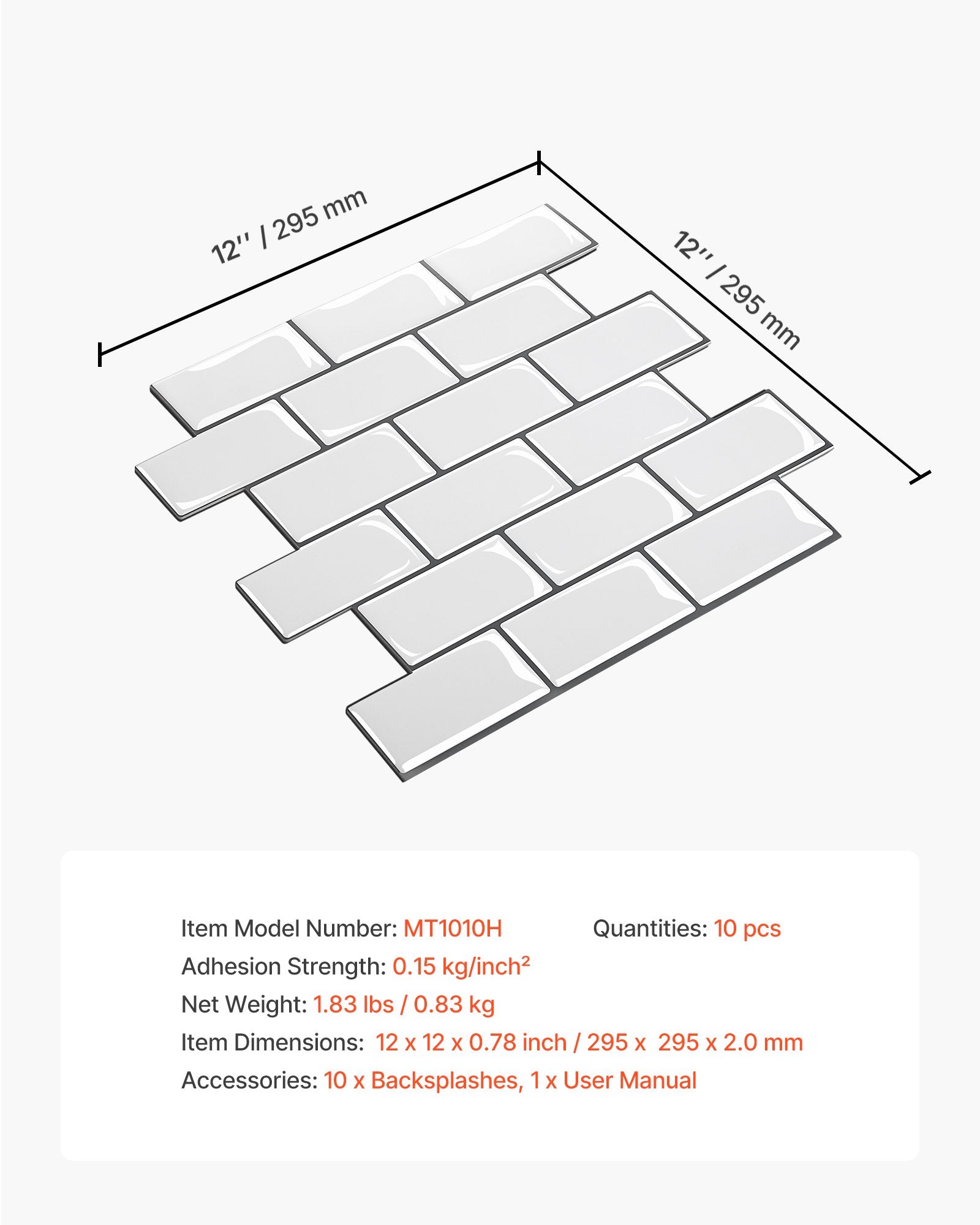 Peel and Stick Backsplash 10-Sheet, 12 x 12 x 0.78 inch / 305 x 305 x 2.0 mm Self-Adhesive Wall Tiles, Stick on Subway Tile Backsplash for Kitchen, 3D Back Splashes for Bathroom, Tile-Look