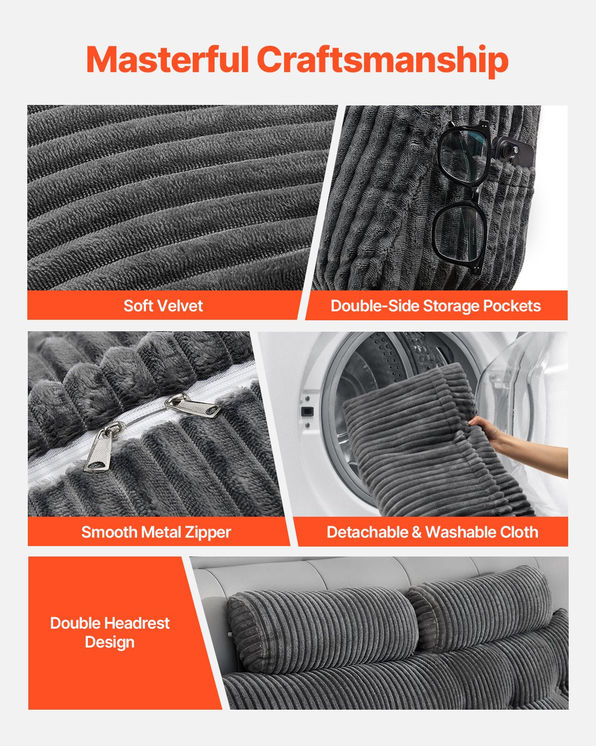 Headboard Pillow, King Size Wedge Headboard Pillow with 2 Side Pockets and 2 Headrests, Bed Wedge Pillow with Washable Flannel Cloth, for Reading, Gaming, Resting, Working in Bed, Grey