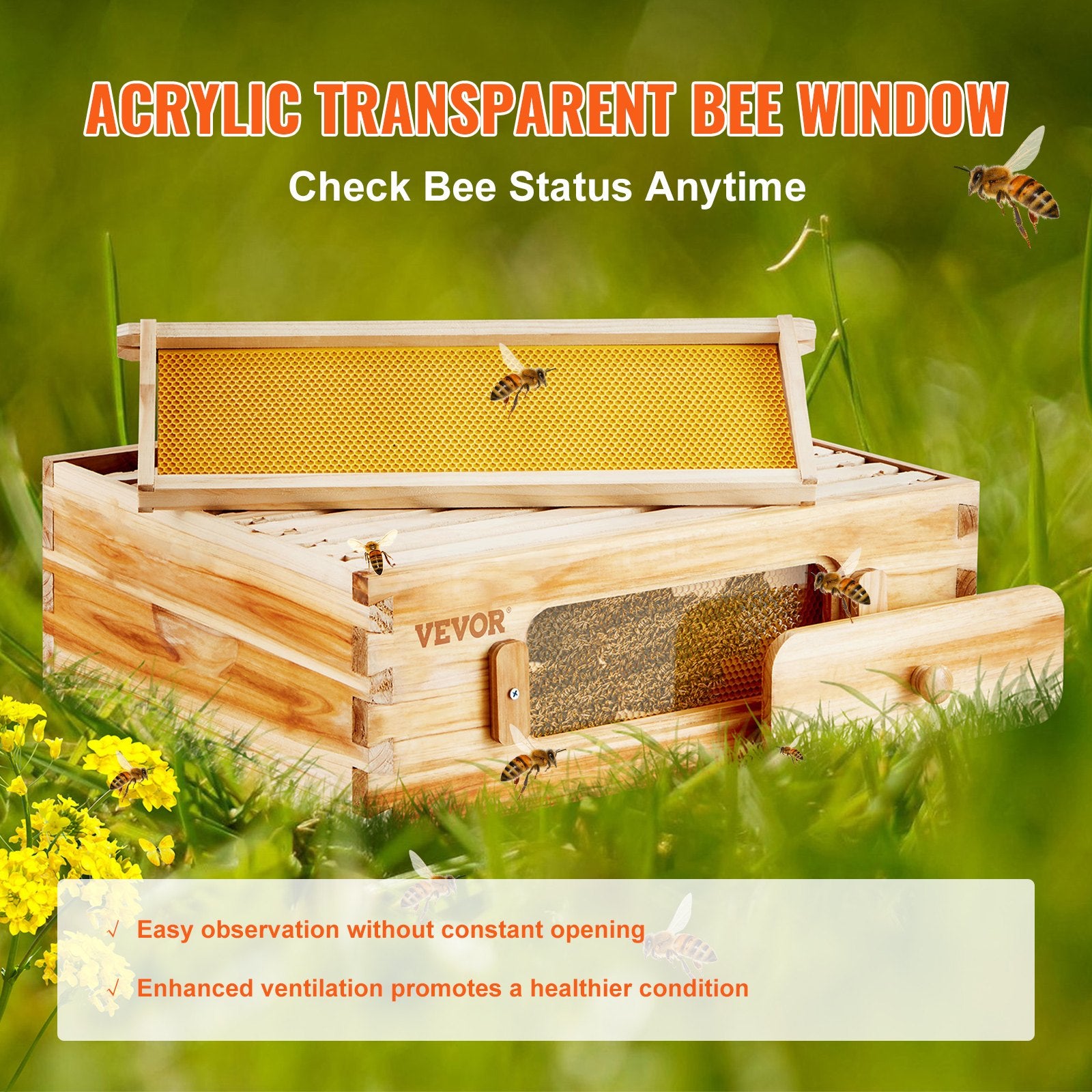 Bee Hive Medium Box Starter Kit, 100% Beeswax Coated Natural Cedar Wood, Langstroth Beehive Kit with 10 Frames and Foundations, Transparent Acrylic Bee Windows for Beginners and Pro Beekeepers