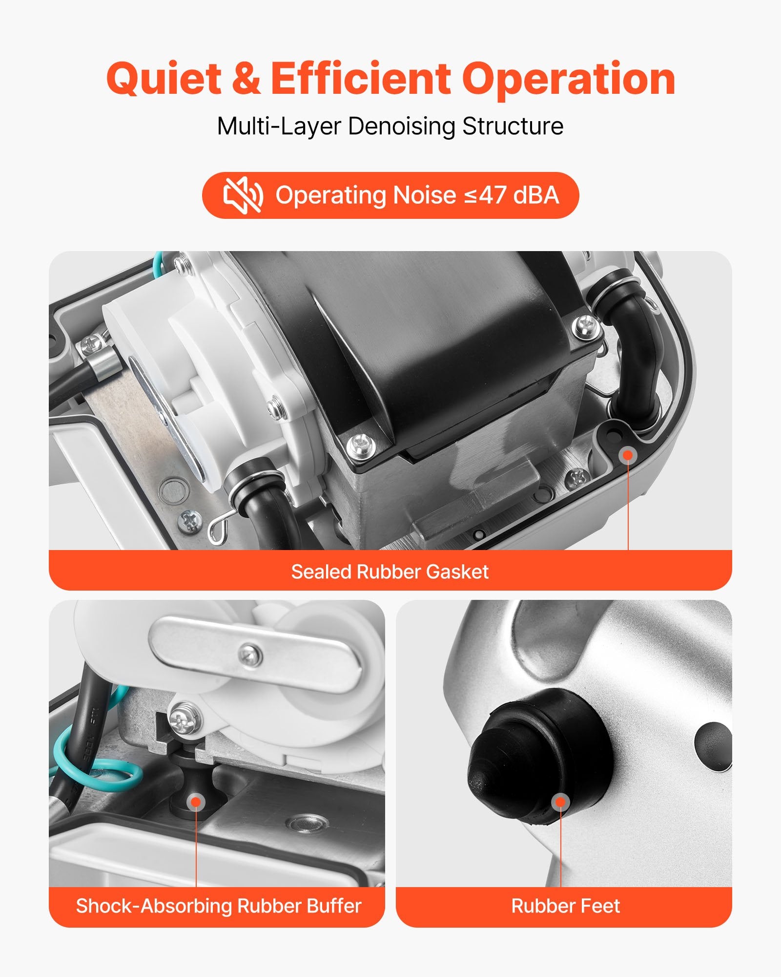 - Quiet Operation: With a pure copper linear motor, the septic air pump operates with noise below 47dBA. The denoising designs like sealed rubber gaskets, shock absorbers, rubber feet, and sealed air chambers provides non-intrusive performance