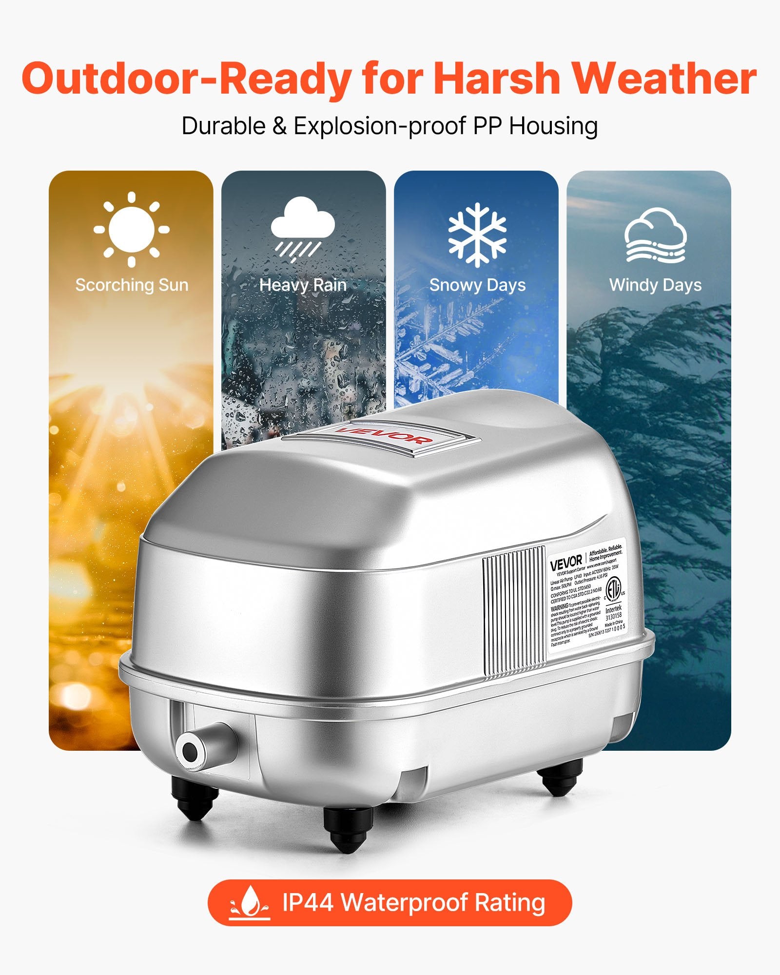- Durable and Reliable: This septic tank air pump has a drop-proof PP housing, an IP44 waterproof rating, and a pleated design for heat dissipation. The built-in inlet filter cotton reduces noise and dust, while the enlarged output delivers strong airflow
