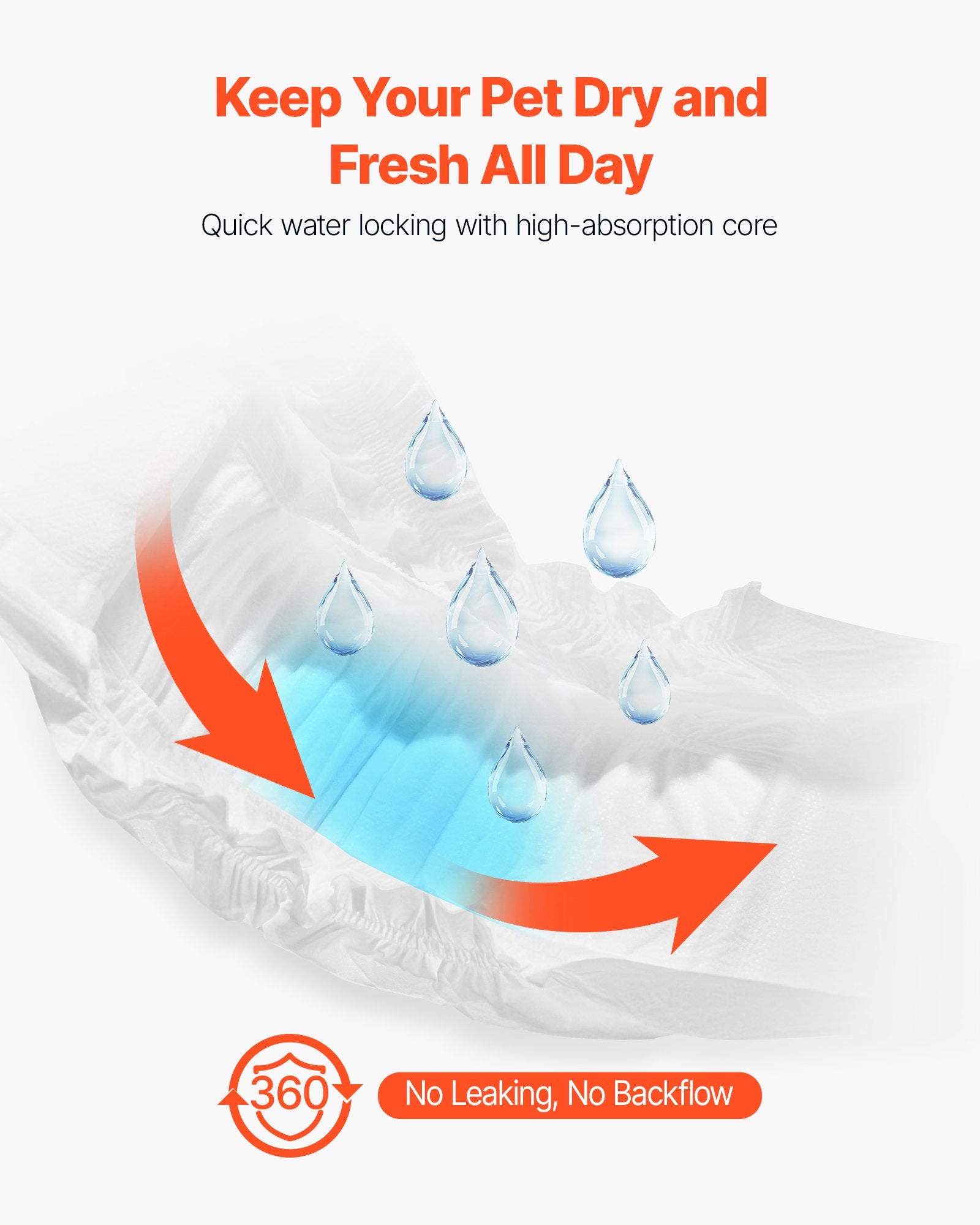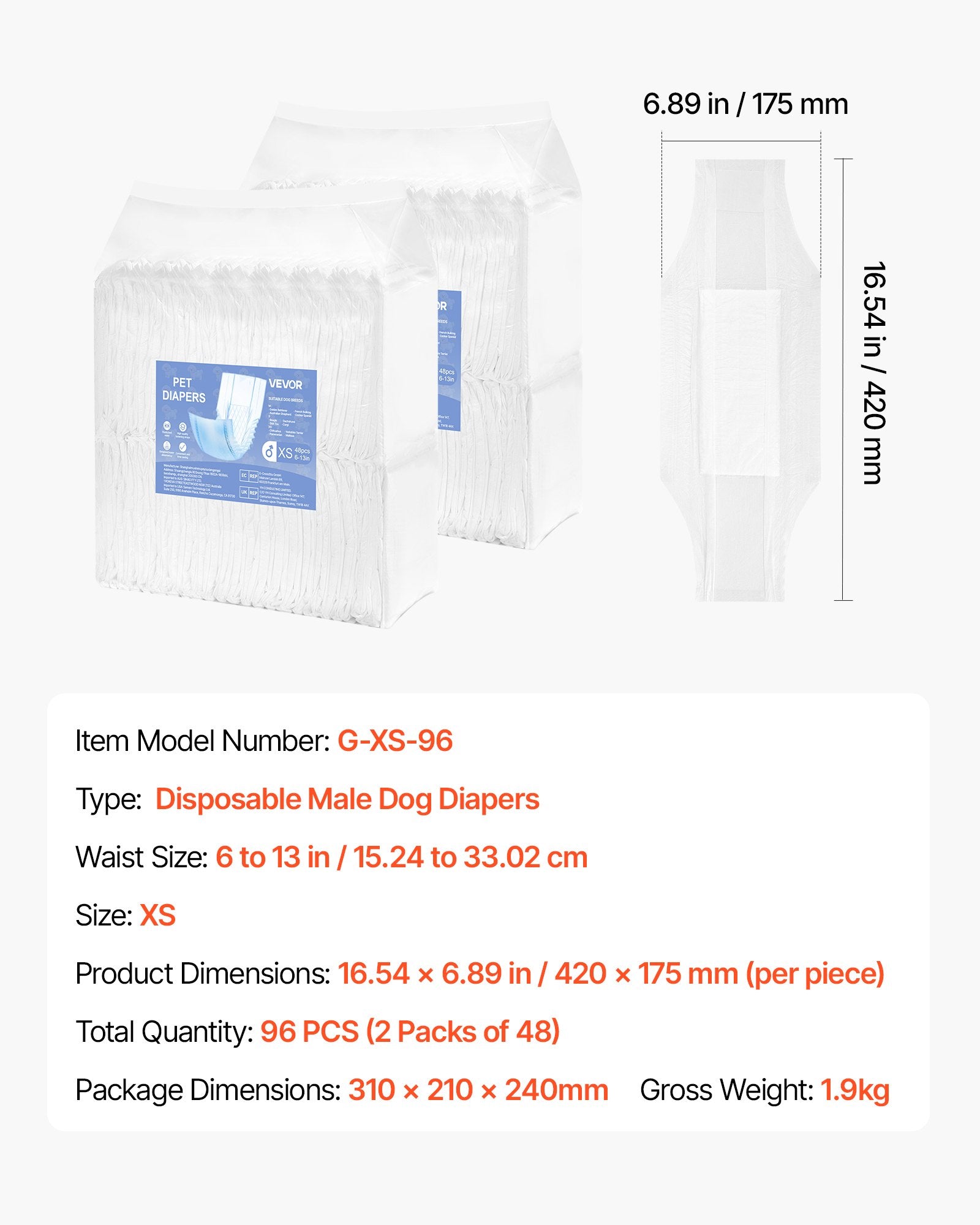 - Super Absorbent: VEVOR XS-sized disposable male dog diapers feature a super absorbent core that quickly locks in liquid, offering 360° leak-proof protection with no backflow. Perfect for dogs in heat cycles, pet training, incontinence, post-surgery recovery, and travel. Suitable Waist Size: 6-13 inches / 15.24 - 33.02 cm