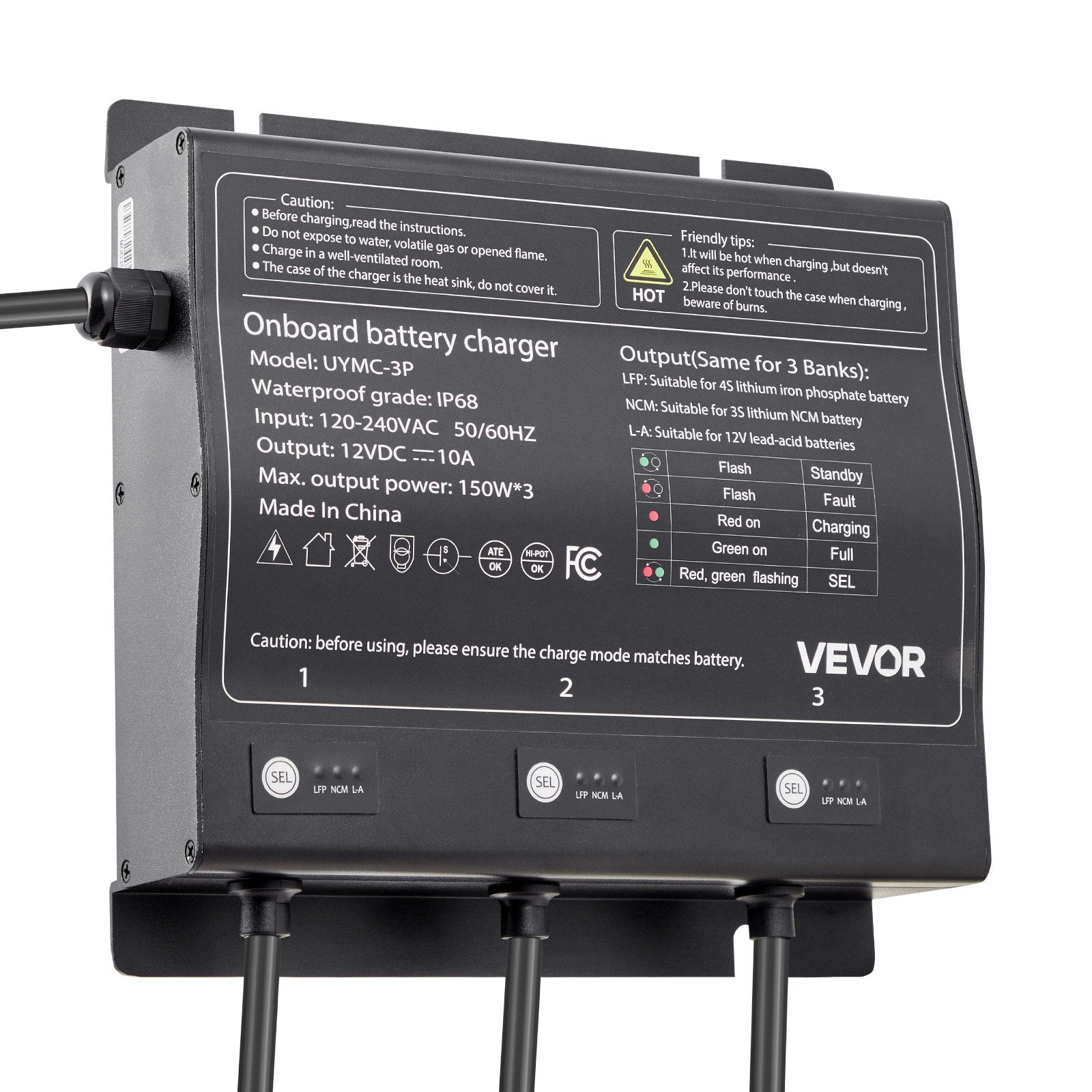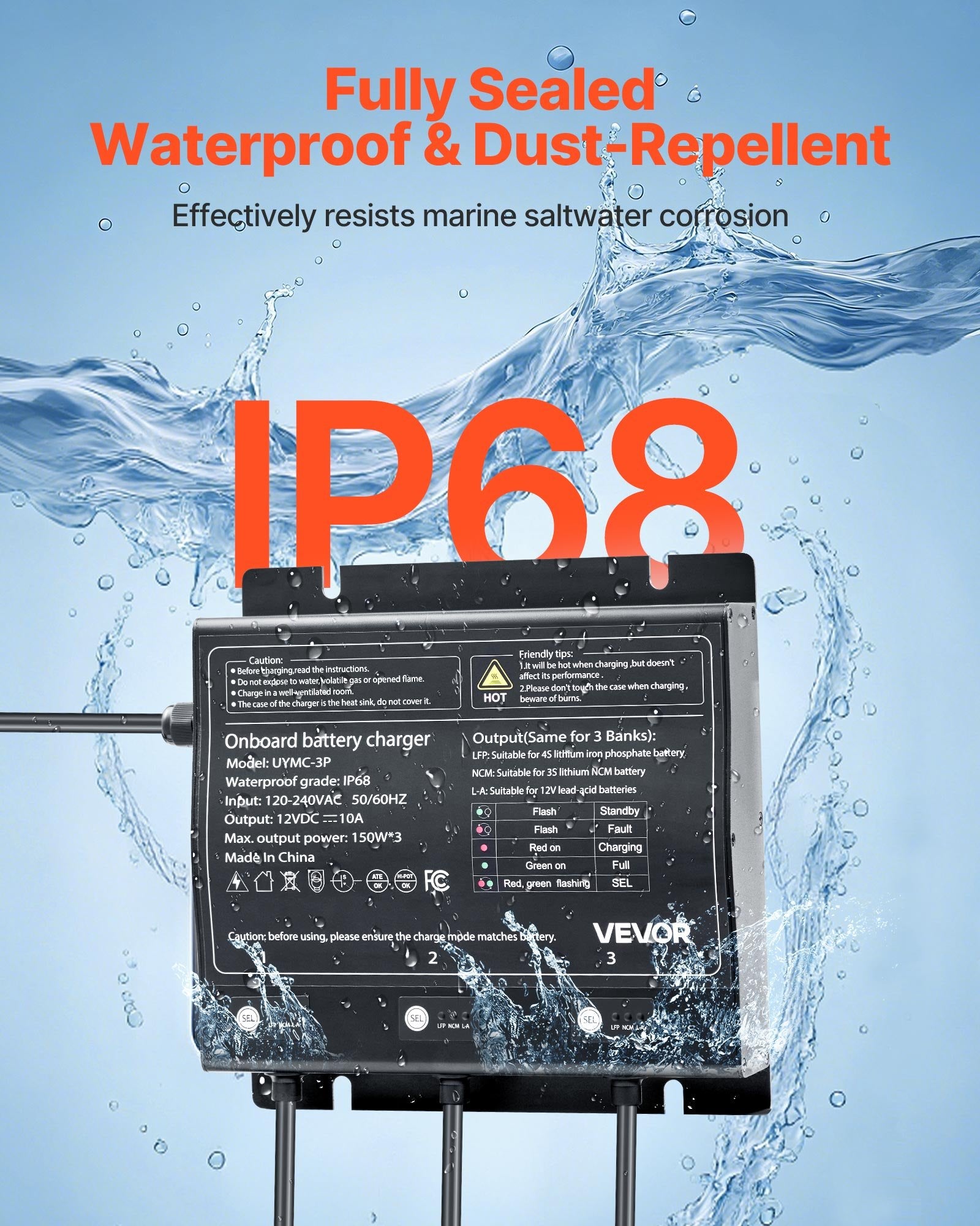Marine Battery Charger, 3-Bank, 10A 12V Onboard Boat Charger, IP68 Waterproof Smart On-Board Battery Charger, for Lithium-Ion (LiFePO4), NCM, Lead-Acid Batteries, Large Boat, Yacht, RV, Trailer