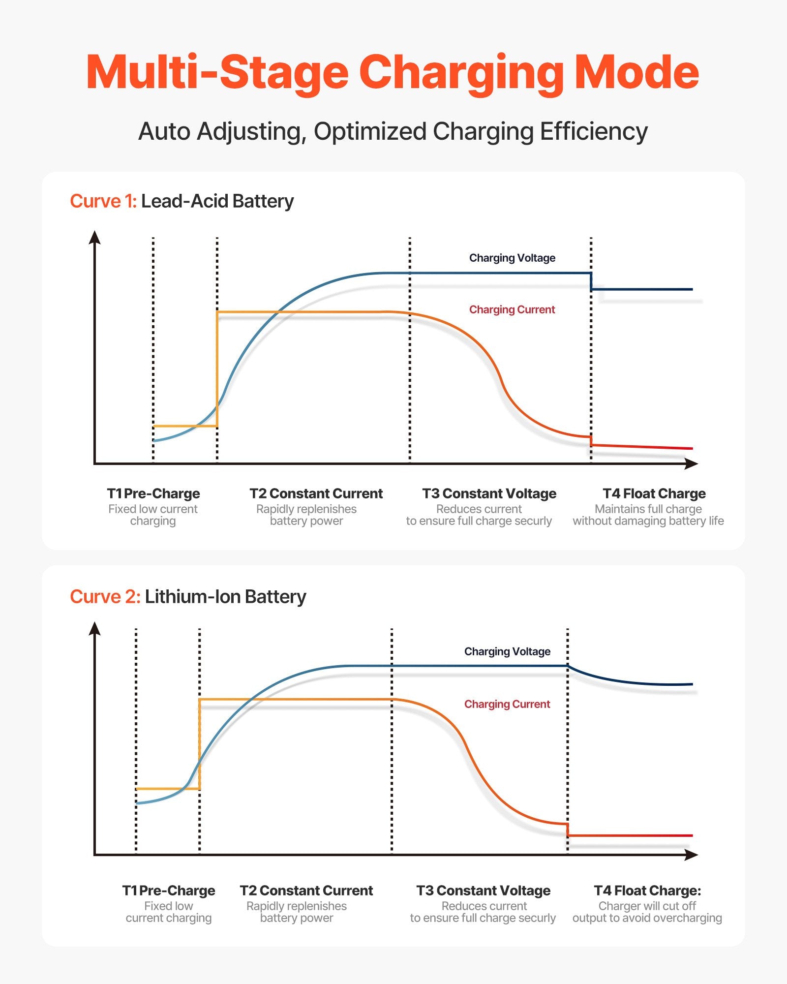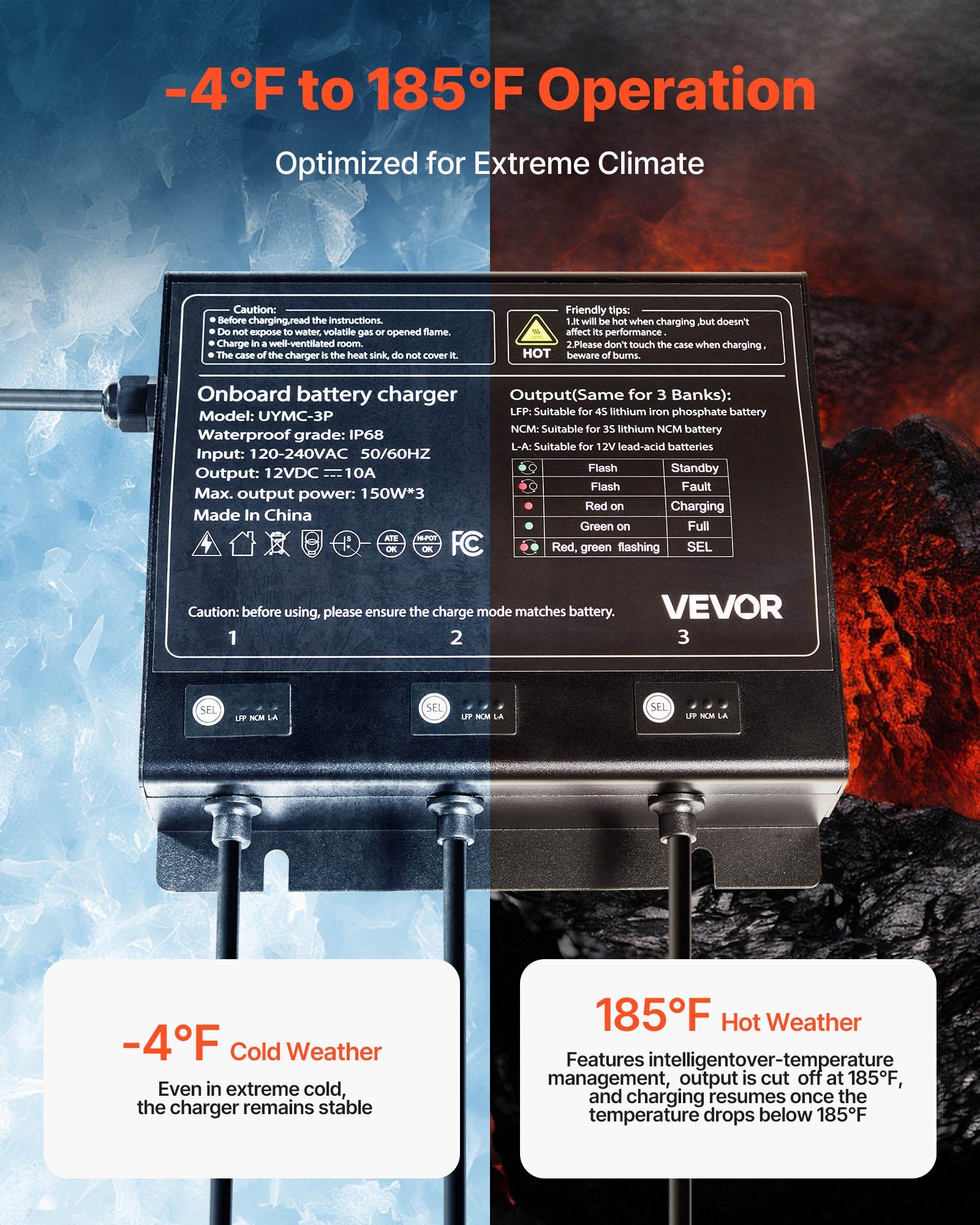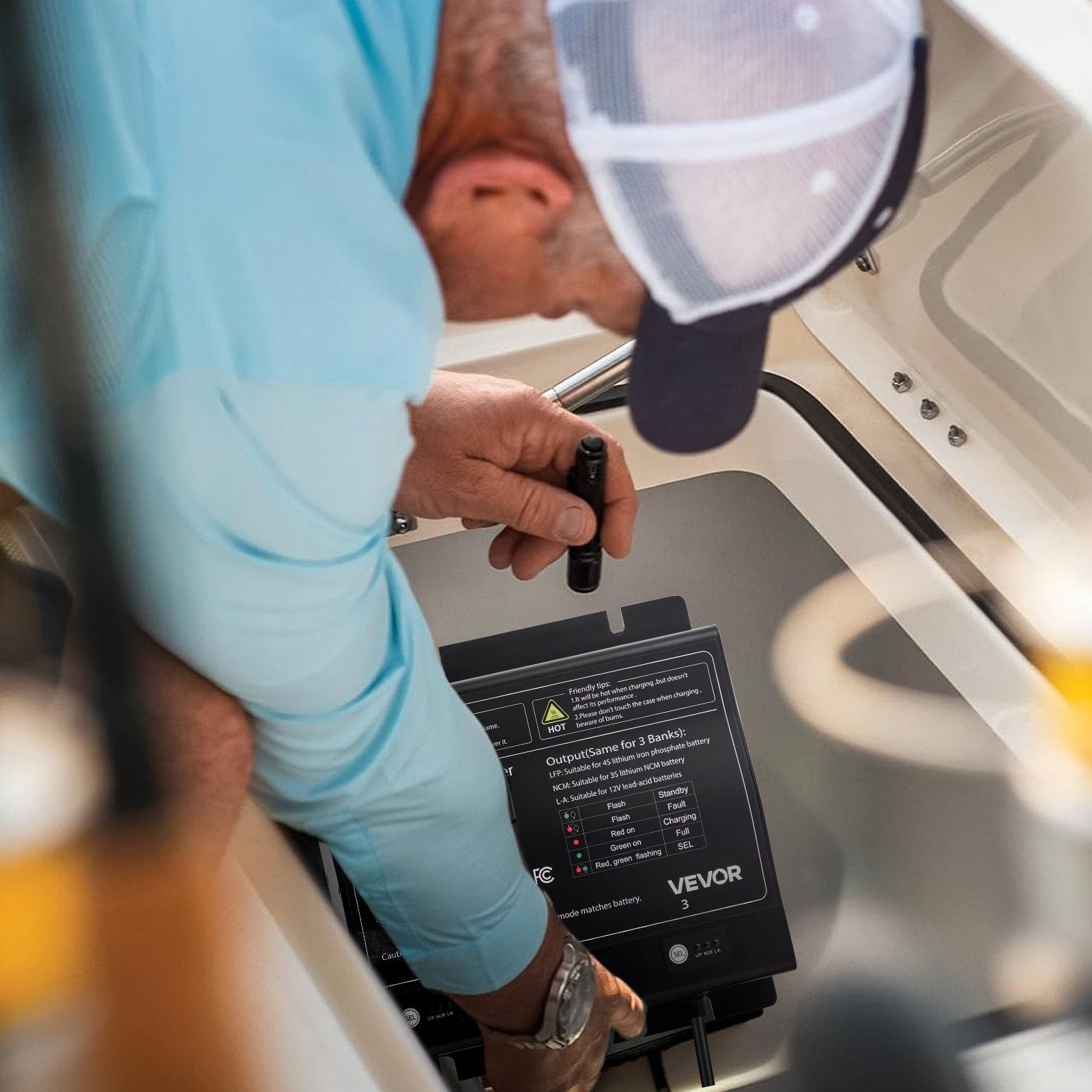 - Marine Battery Charger: This marine battery charger provides a stable 3-bank 12V/10A output, compatible with lead-acid and lithium-ion batteries. Three charging modes (LFP, NCM, L-A) ensure efficient, secure charging for various battery types