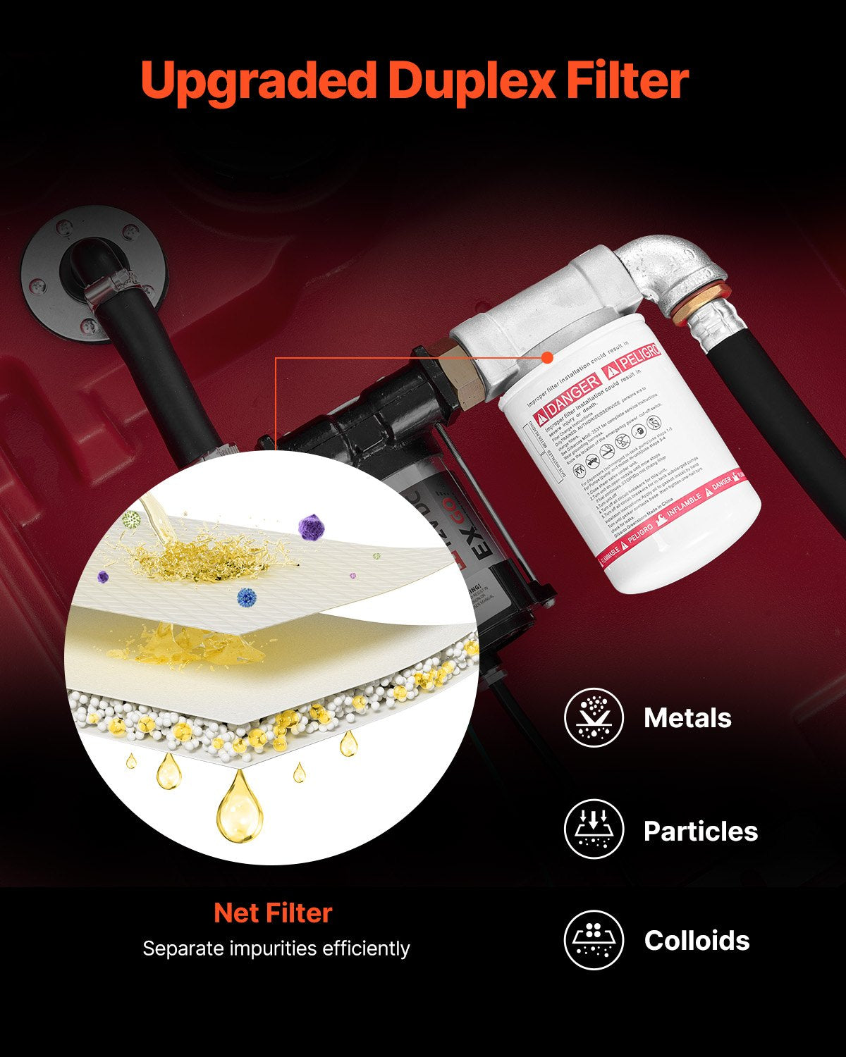 - Upgraded Filter Design: Compared with other products, our fuel transfer tank is equipped with a duplex filter to provide purer diesel. The front-end filter of the inner tank can separate large particles of impurities, and the premium outer filter is designed to filtrate small impurities such as metal, colloids, tiny particles, etc.
