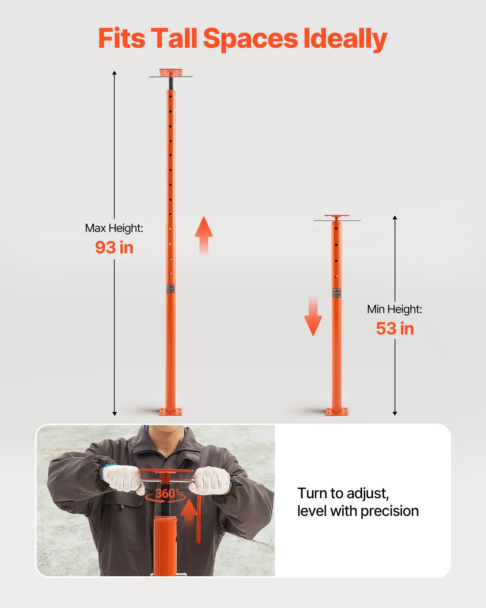- Adjustable Height Design: Need flexibility? This house floor jack features an adjustable height design. It adjusts from 53 to 93 in/1346 to 2362 mm, so you can find the ideal height for your needs