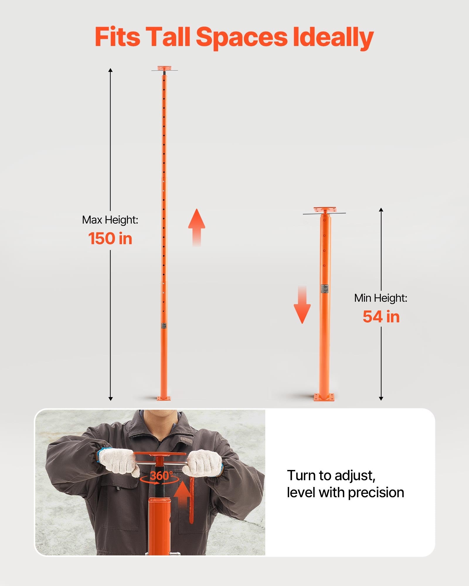 - Adjustable Height Design: Need flexibility? This house floor jack features an adjustable height design. It adjusts from 54 to 150 in/1372 to 3810 mm, so you can find the ideal height for your needs