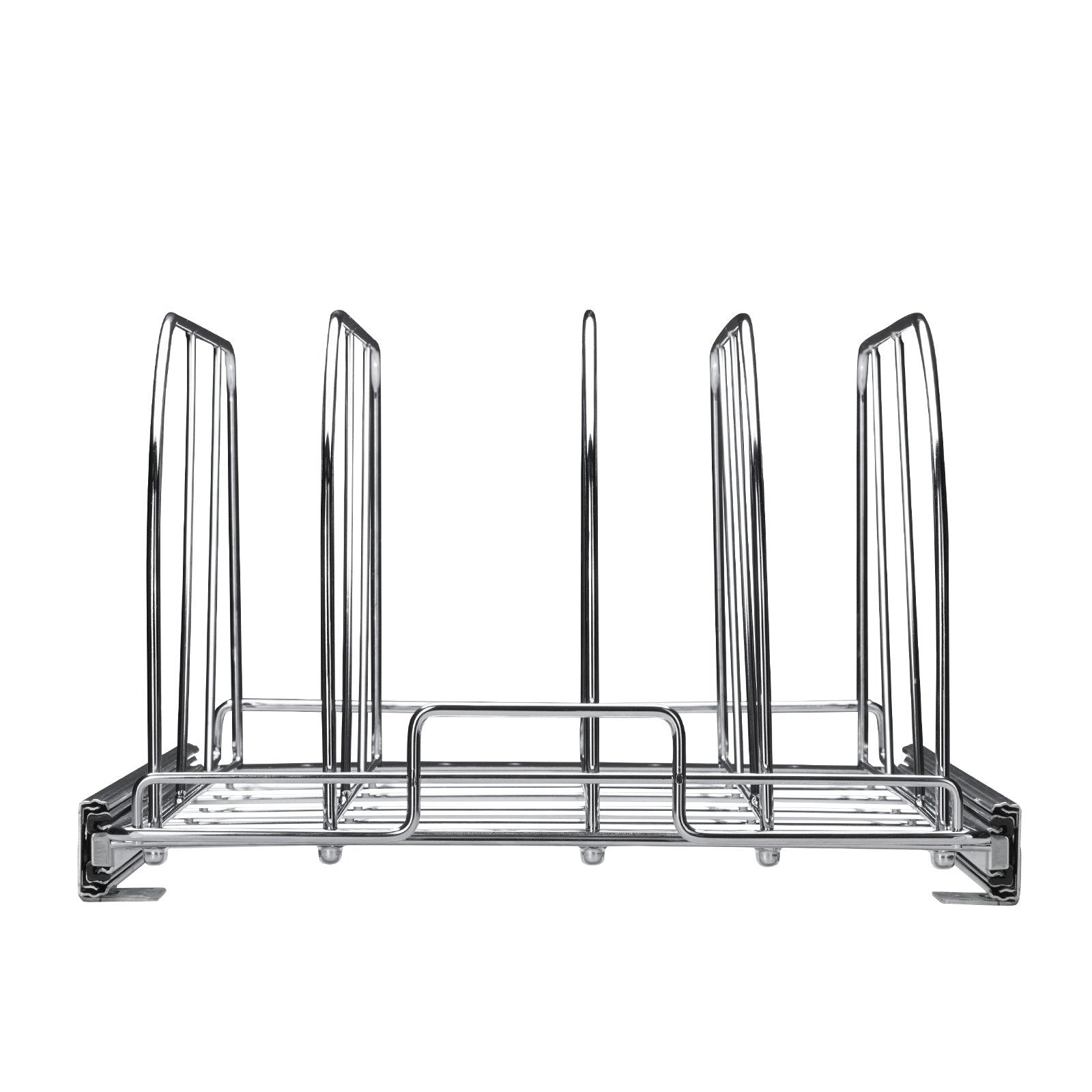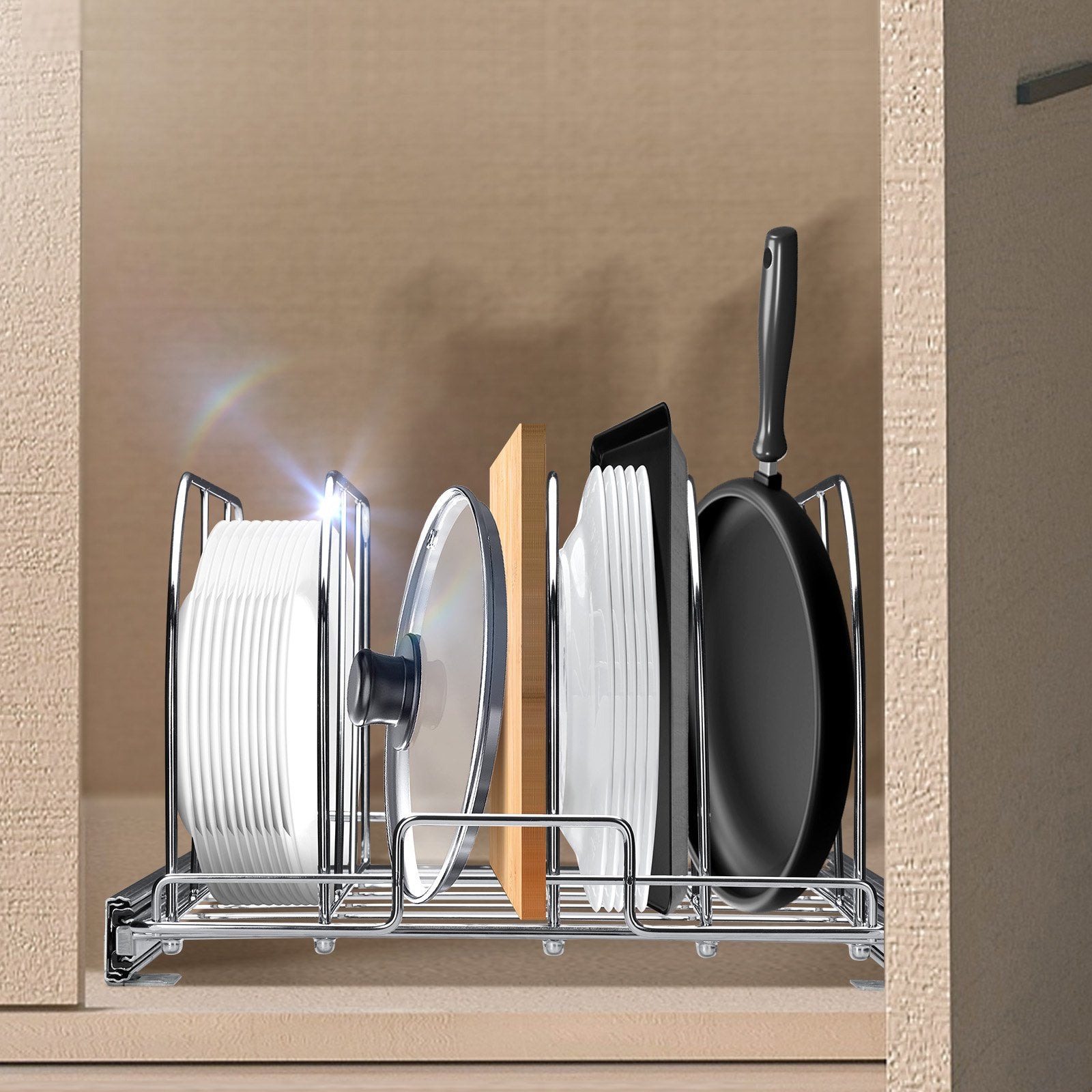- Spacious Storage Space: Ready to say goodbye to your messy kitchen with our pan and pot rack. This sliding kitchen cabinet organizer can hold frying pans, baking pans, serving trays, cutting boards, and lids, making them easily accessible.