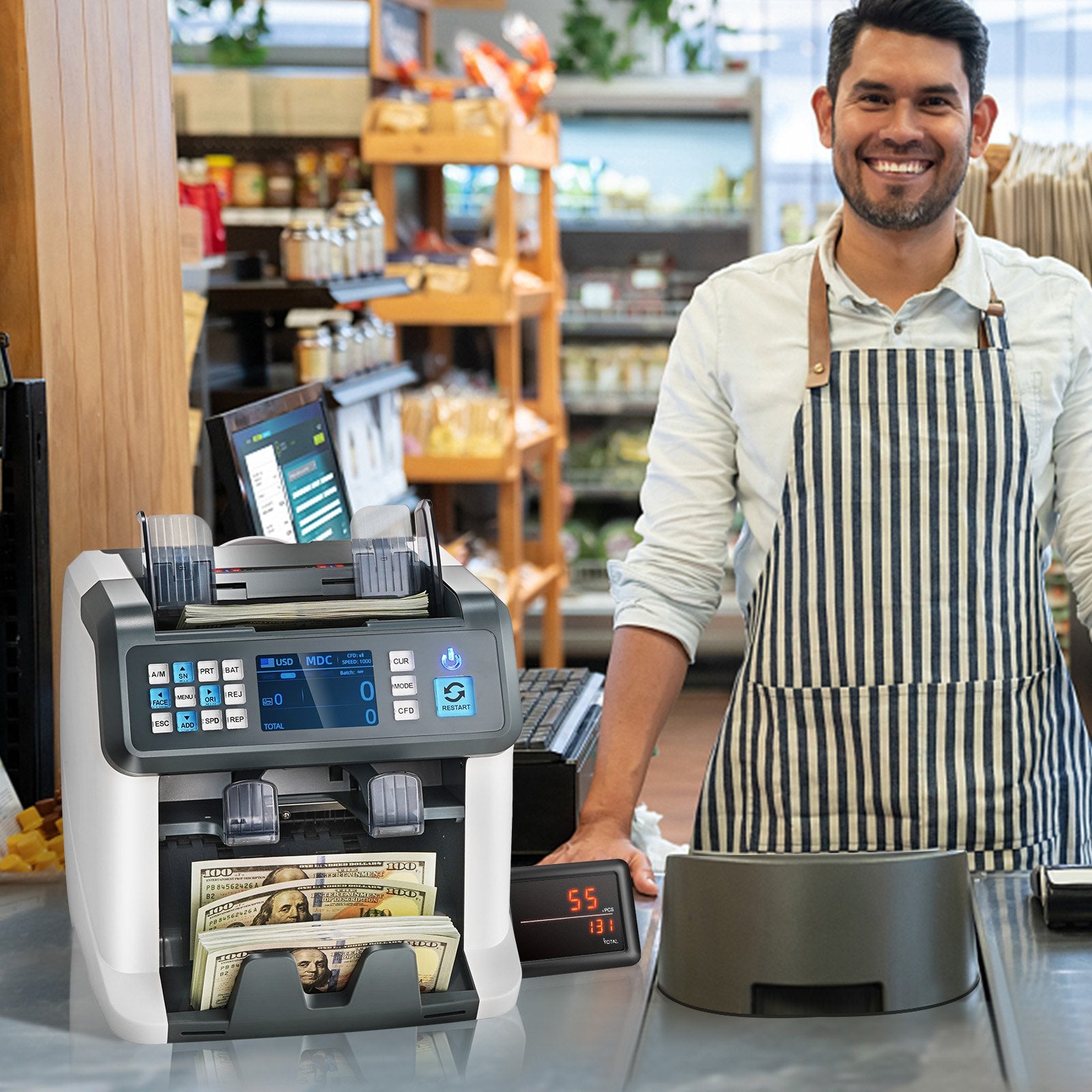 - Perfect for Business: Our cash counter has an RS232 port that supports printer connection. And it supports USB upgrades to recognize new currency or counterfeit bills. This machine is perfect for managing money in small businesses, gas stations, retail stores, restaurants, and bars. The package also includes everything you need to start counting cash right away, such as a power cord, cleaning brush, fuse, external display, and more.