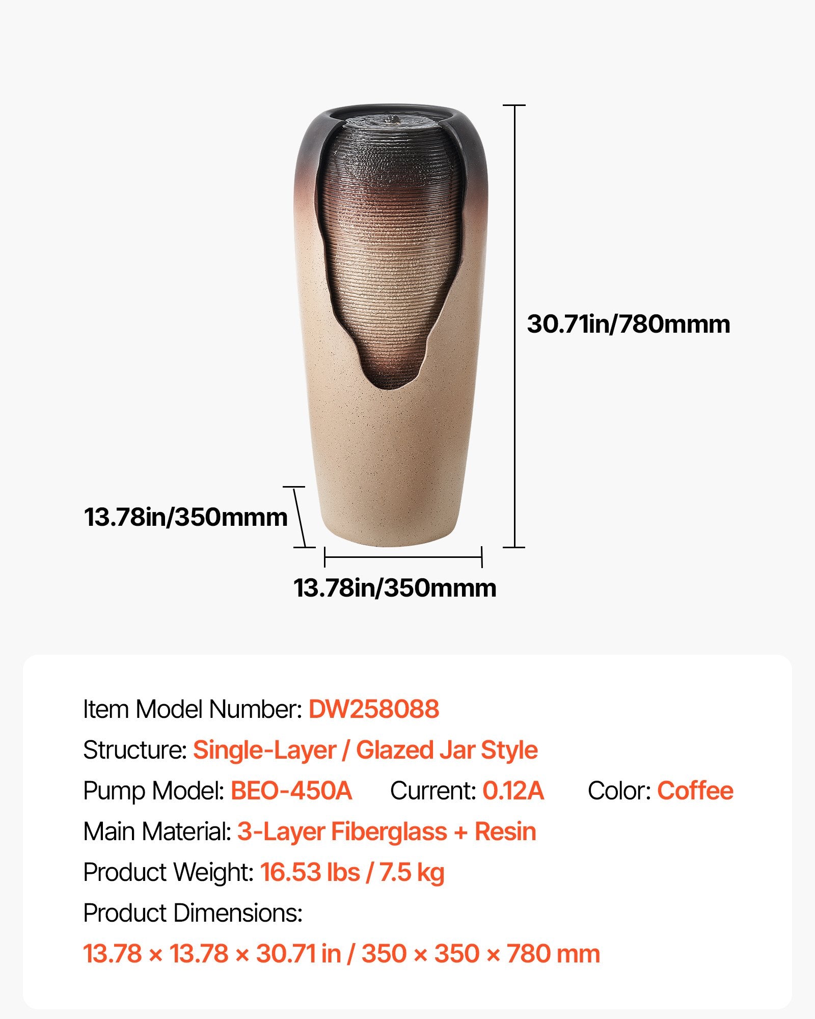 Outdoor Water Fountain, 30.71 in Height Fountain and Waterfall, 1-Tier Floor Standing Glazed Jar Style Fountains with LED Light and Pump, for Outdoor Indoor Garden, Home, Patio & Yard (Coffee)