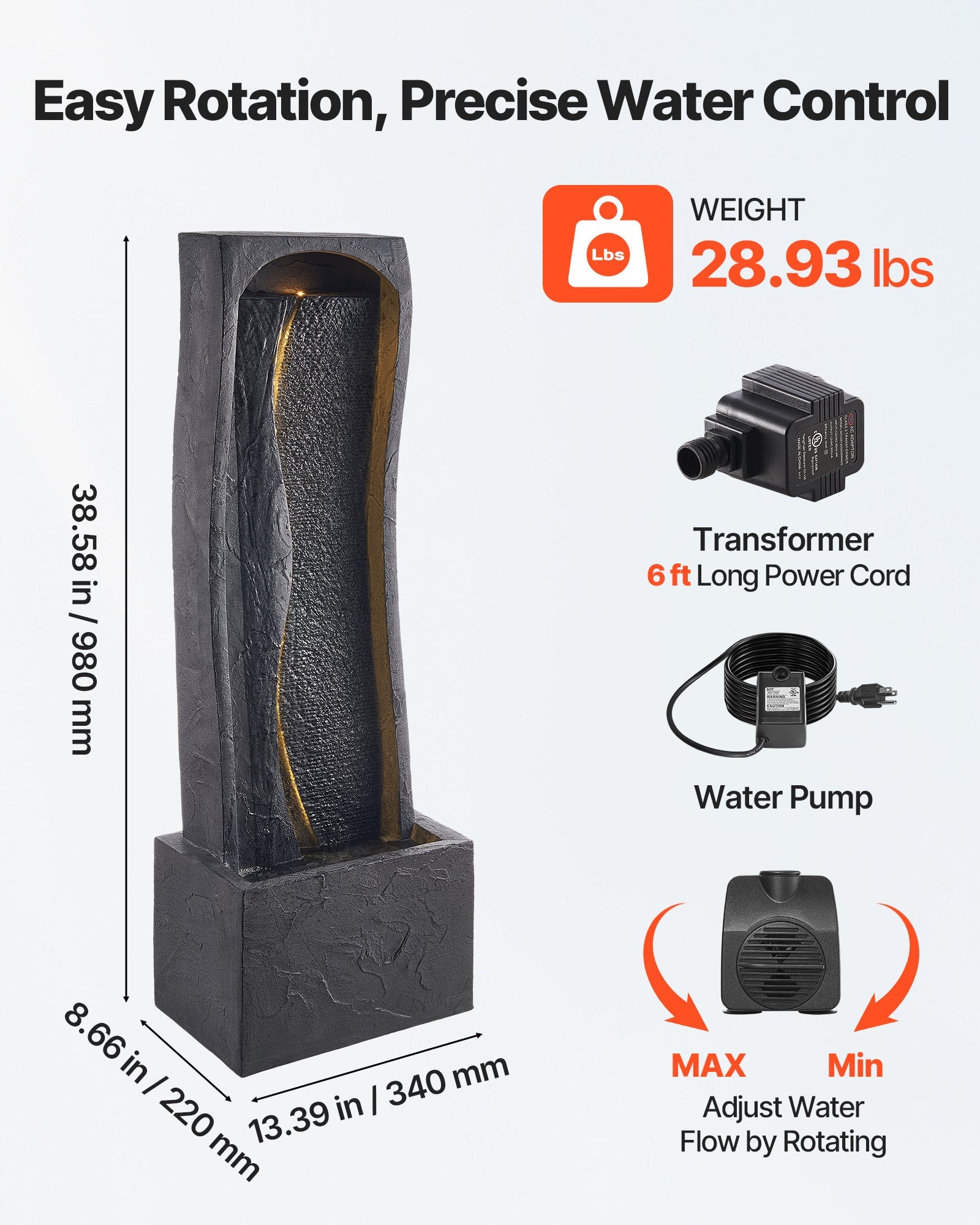 - LED Lighting: The yard water fountain features built-in soft LED lights, creating a calming lighting effect at night. With a 6 ft power cord and dual power supplies for the pump and light, it’s easy to maintain and adaptable to various settings