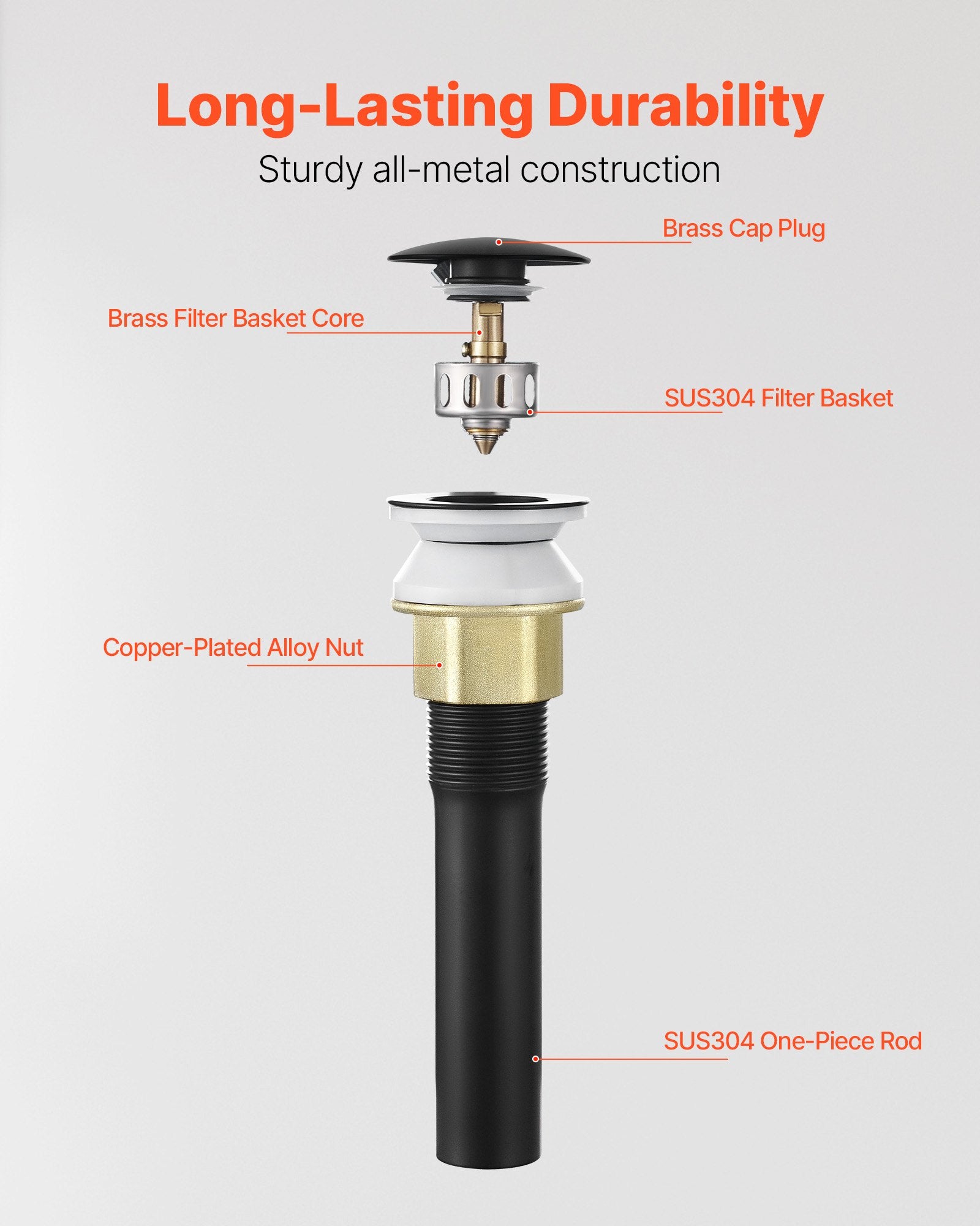 - All-Metal Material: This bathroom sink drain is made from solid brass and SUS304 stainless steel, ensuring durability. It maintains excellent performance and appearance in daily or humid conditions. Ideal for your bathroom.