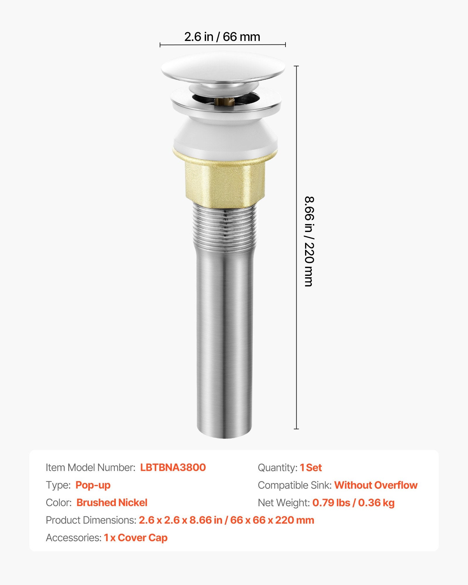 - Standard Drain Pipe: Compatible with sinks without overflow holes, this vessel sink drain fits holes of 1.5-1.9 in and sink thicknesses of 0.78-1.97 in. Drain pipe diameter is 1.25 in. Please confirm compatibility with your sink before purchase.
