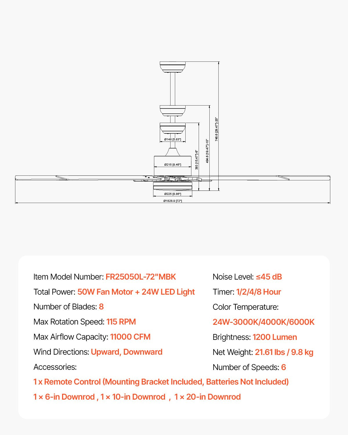 - 10-in Downrod: Φ72.44 x 19.47"/Φ1840 x 494.6 mm