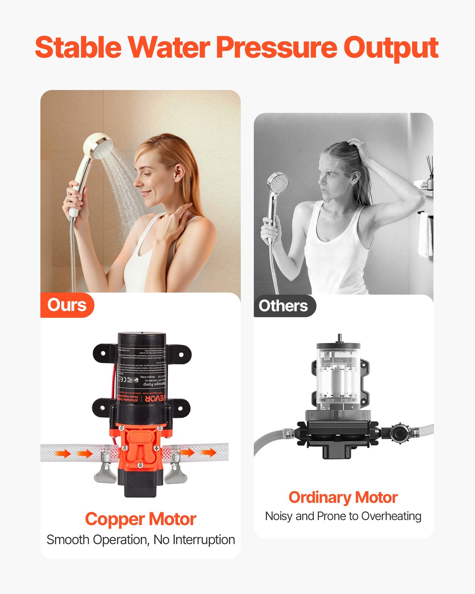 - Secure & Durable Operation: Features a pure copper motor and built-in overheat and overload protection, this diaphragm water pump operates securely and reliably. It avoids burnout and extends service life for long-lasting reliability