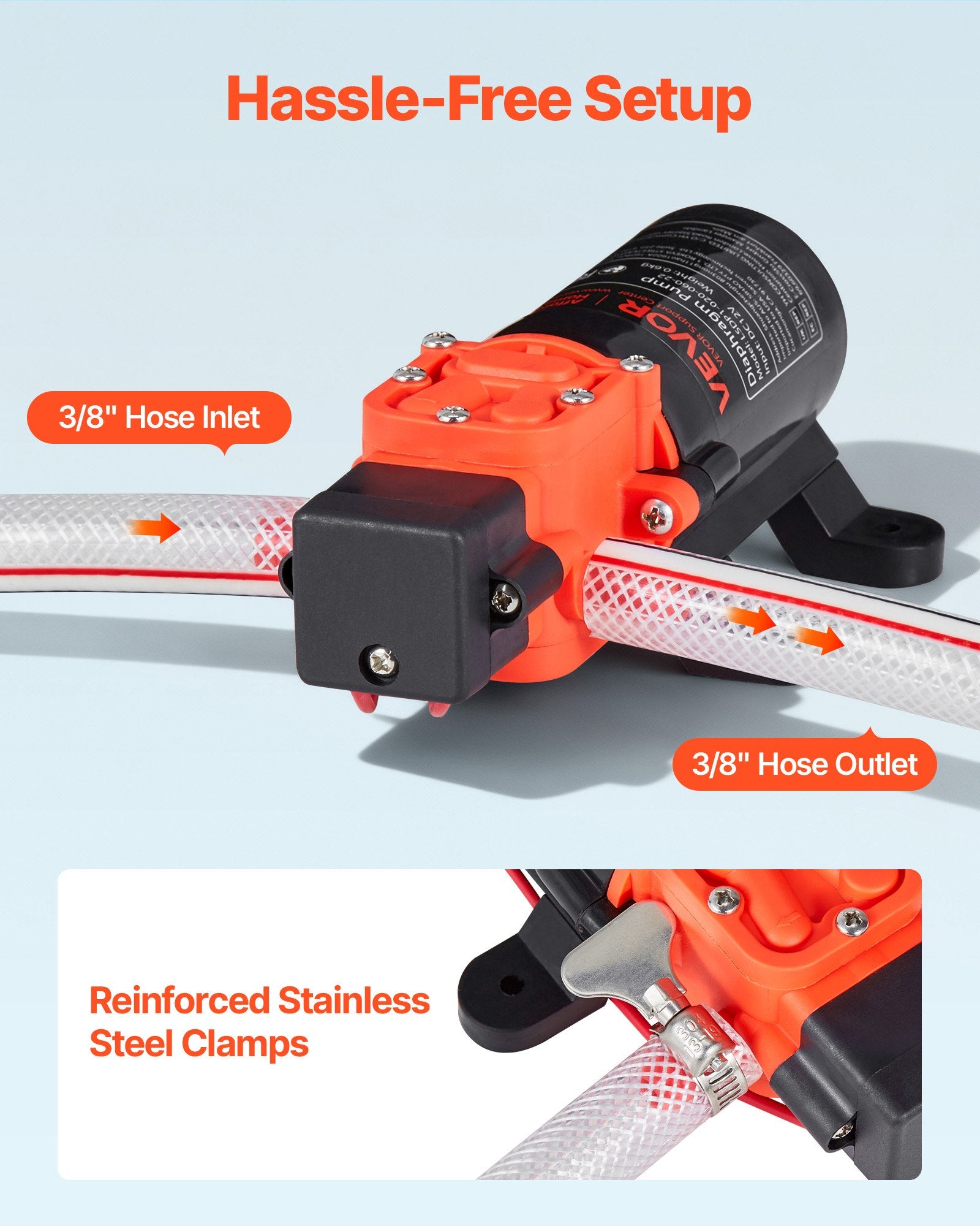 - 3/8-Inch Hose Connection: Equipped with a hose adapter, our diaphragm pump quickly connects to any standard 3/8 in hose. Stainless steel clamps reinforce the connection, PTFE tape enhances thread sealing to avoid leaks, and the filter blocks large debris