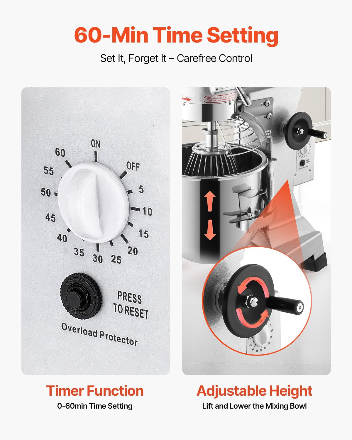- Protective Design: A stainless steel wire bowl guard is designed to keep large items from falling into the bowl during operation; The height of the bowl can be easily adjusted by a turning wheel; The START and STOP buttons operate independently, ensuring security.