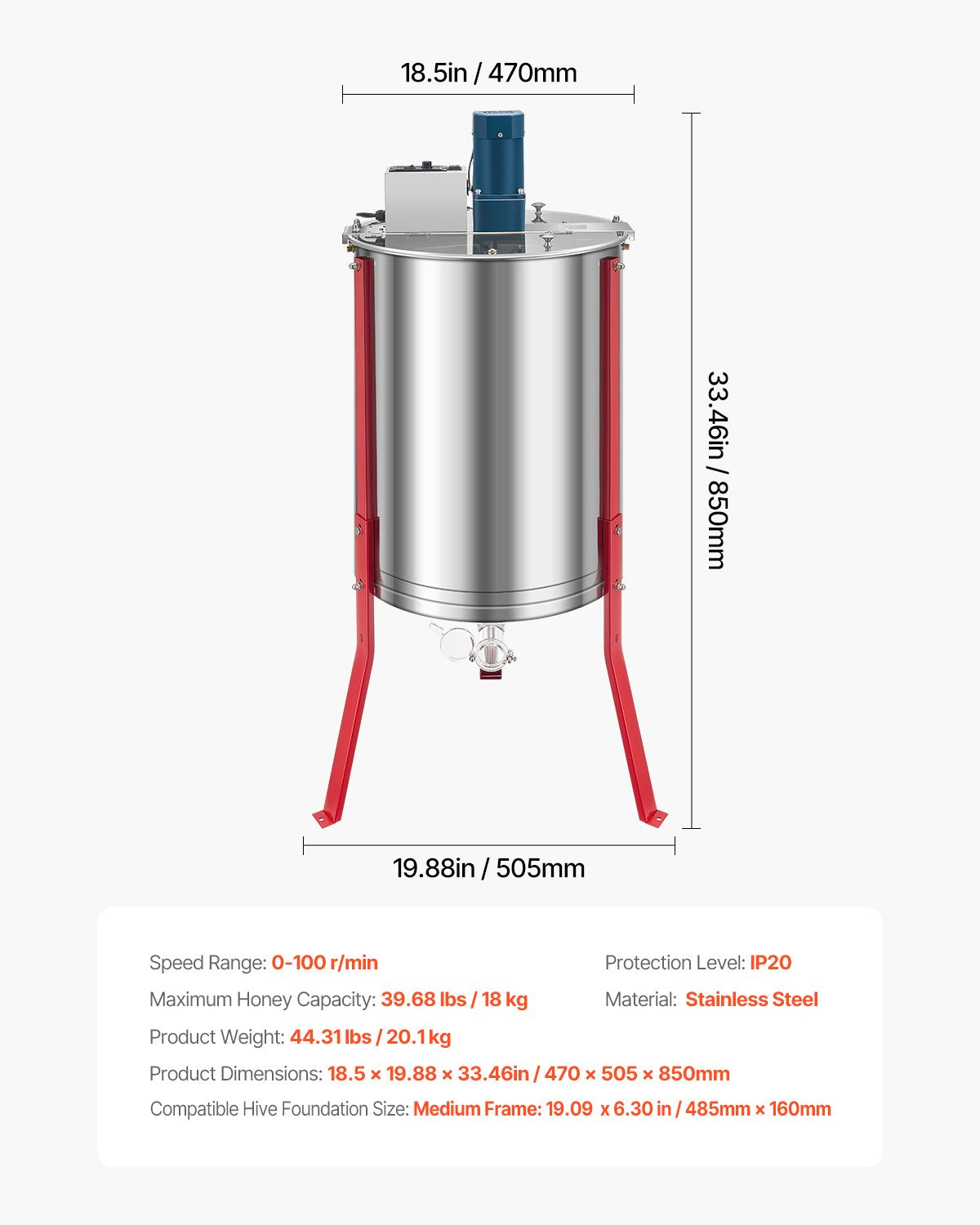 - Stepless Speed Adjustment: Our electric honeycomb extractor with 0-100 RPM adjustable speed allows for customization based on honey viscosity, preserving hive integrity and maximizing honey extraction. Ensures optimal extraction results every time.