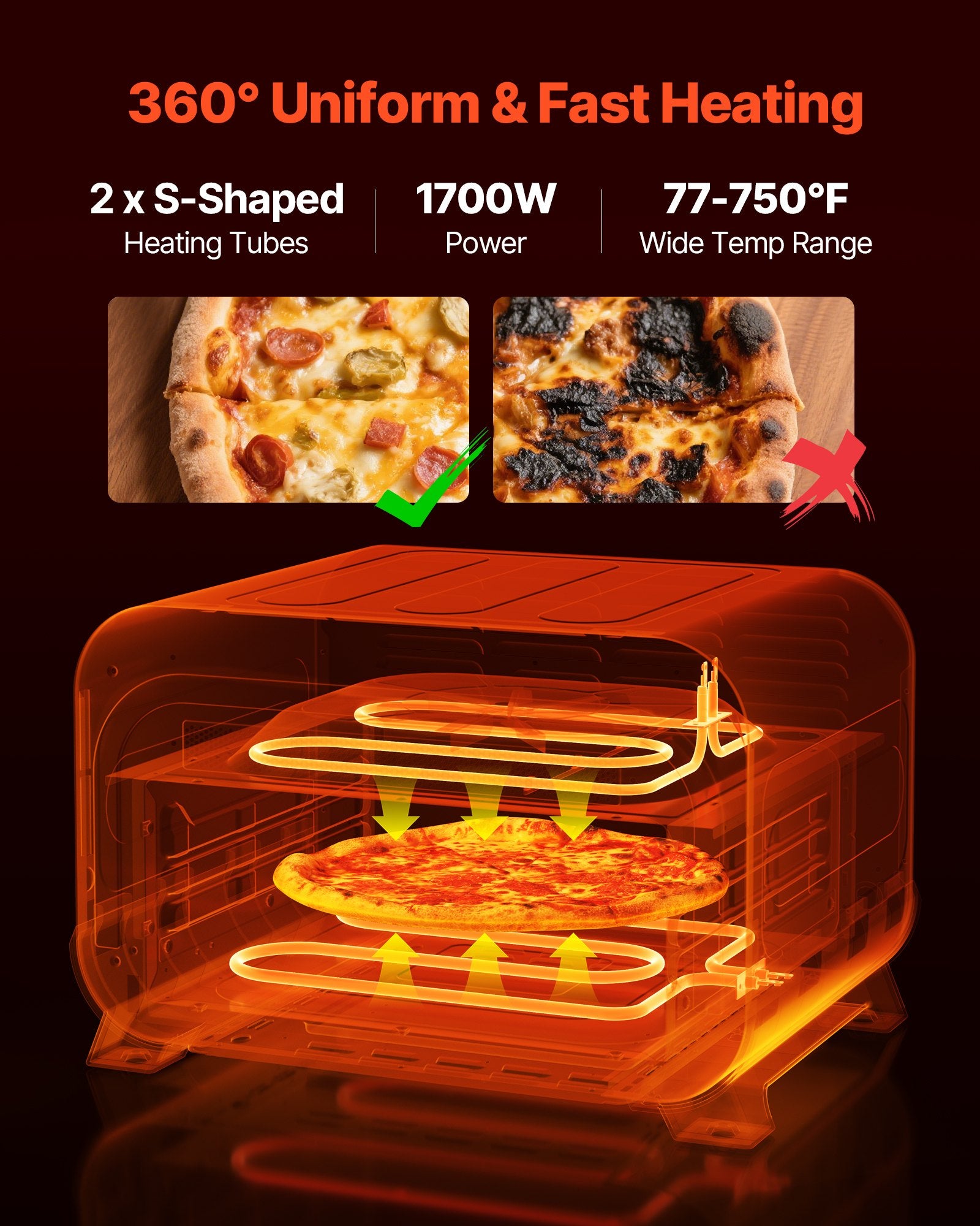 - 2-Minute Artisan Pizza: Our pizza oven heats up to 750℉ with 1700W high power and dual heating element—no flipping needed. Enjoy restaurant-style crispy crust and balanced texture in just 2 minutes.
