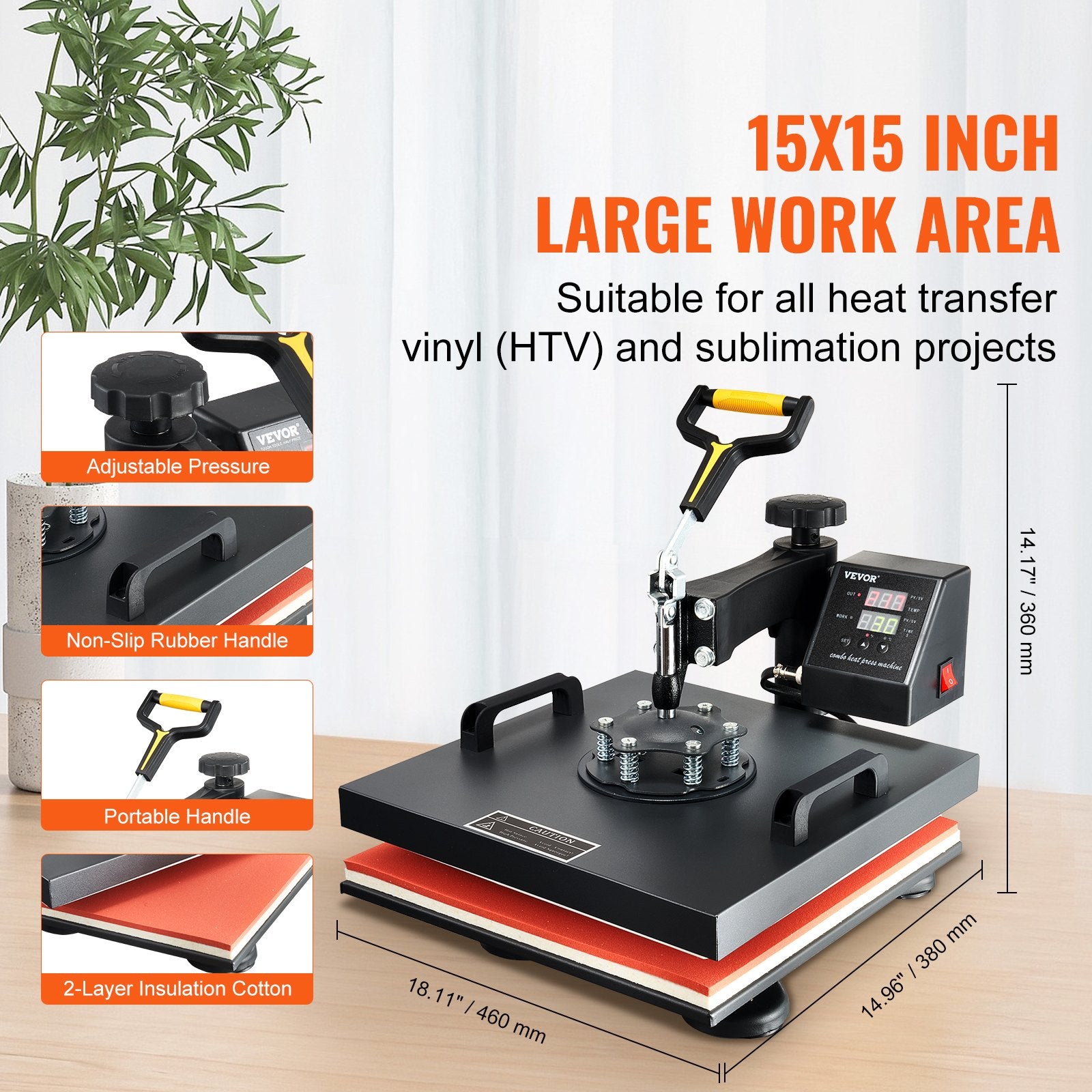 - 【8-IN-1 VERSATILE KIT】- With a 15" x 15" (38 x 38 cm) large heat platen, the shirt press machine uses Teflon-coated platen, non-stick & stable. Suitable for applying letters, numbers, and patterns onto caps, T-shirts, cups, plates, etc.