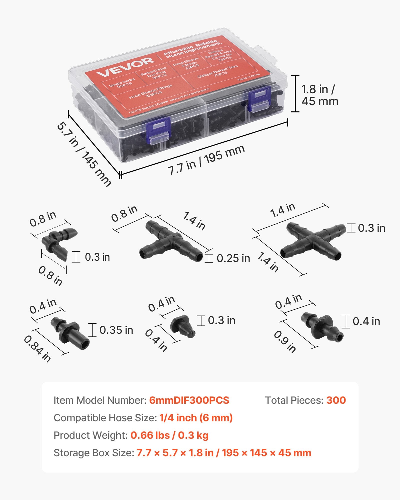 - Barbed Straight Connector: 0.9 × 0.4 × 0.4 in / 22.5 × 11 × 9.2 mm (105pcs)