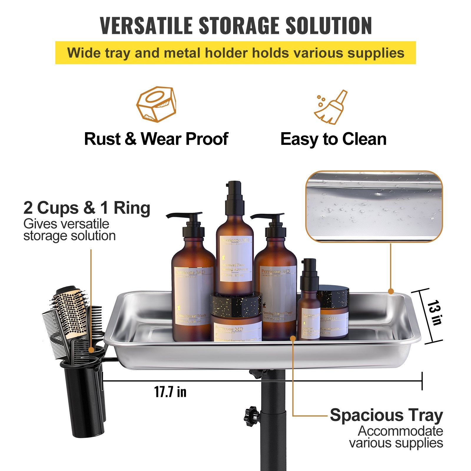 - Freely Adjustable Height: The height of the salon tray can be freely adjusted between 26in to 43.3in. And it is super simple, just rotate the knob, and then set your desired height. Bending up and down can take a toll on your back. Whether you are tall or short, our tray can meet the various heights of people.