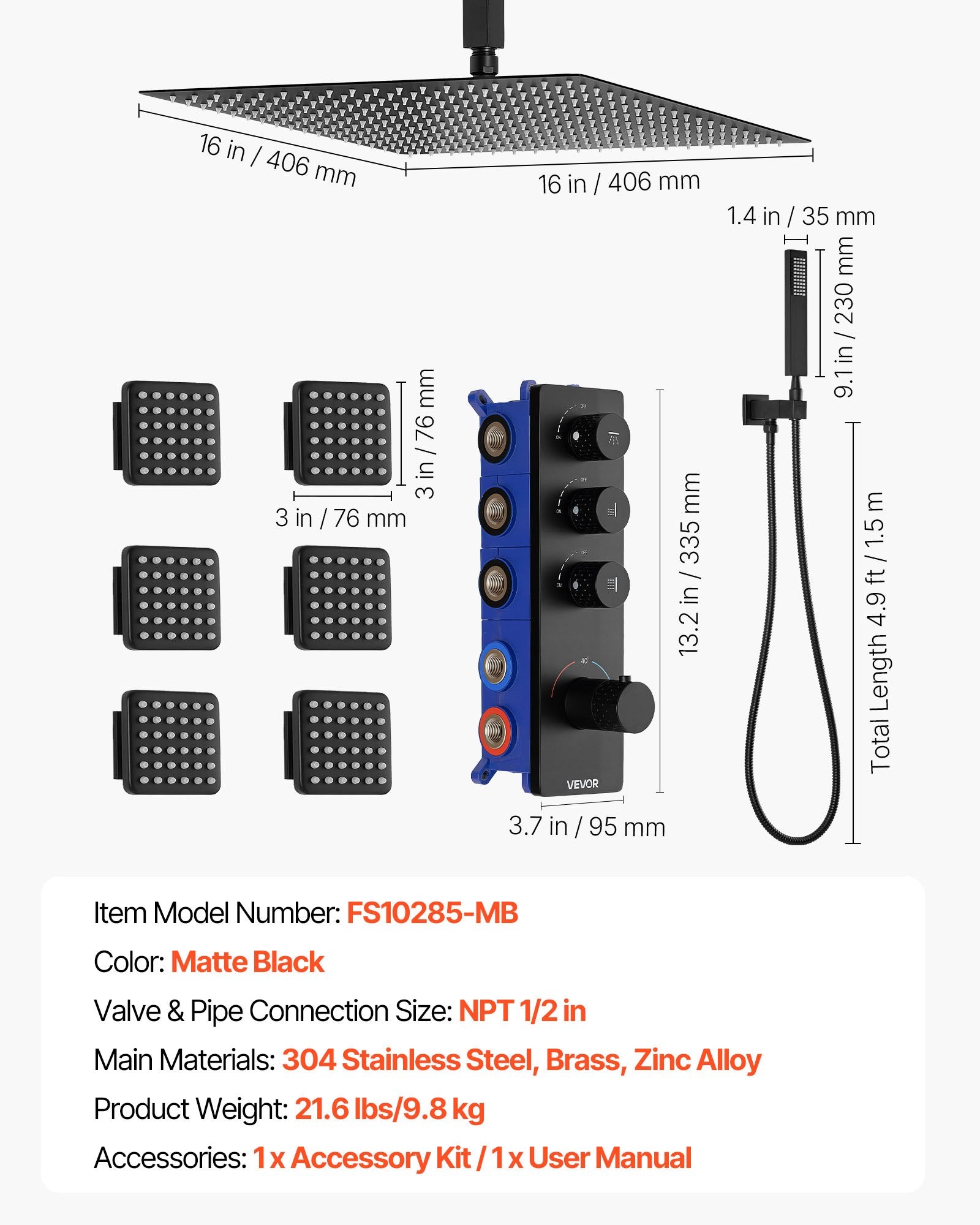 - Deep Cleaning: This rainfall shower system includes a 16-inch square shower head that covers your whole body, mixing air and water for a full, rain-like experience. A 4.9 ft/1.5 m hose with a swivel holder supports multi-angle deep cleaning for your body