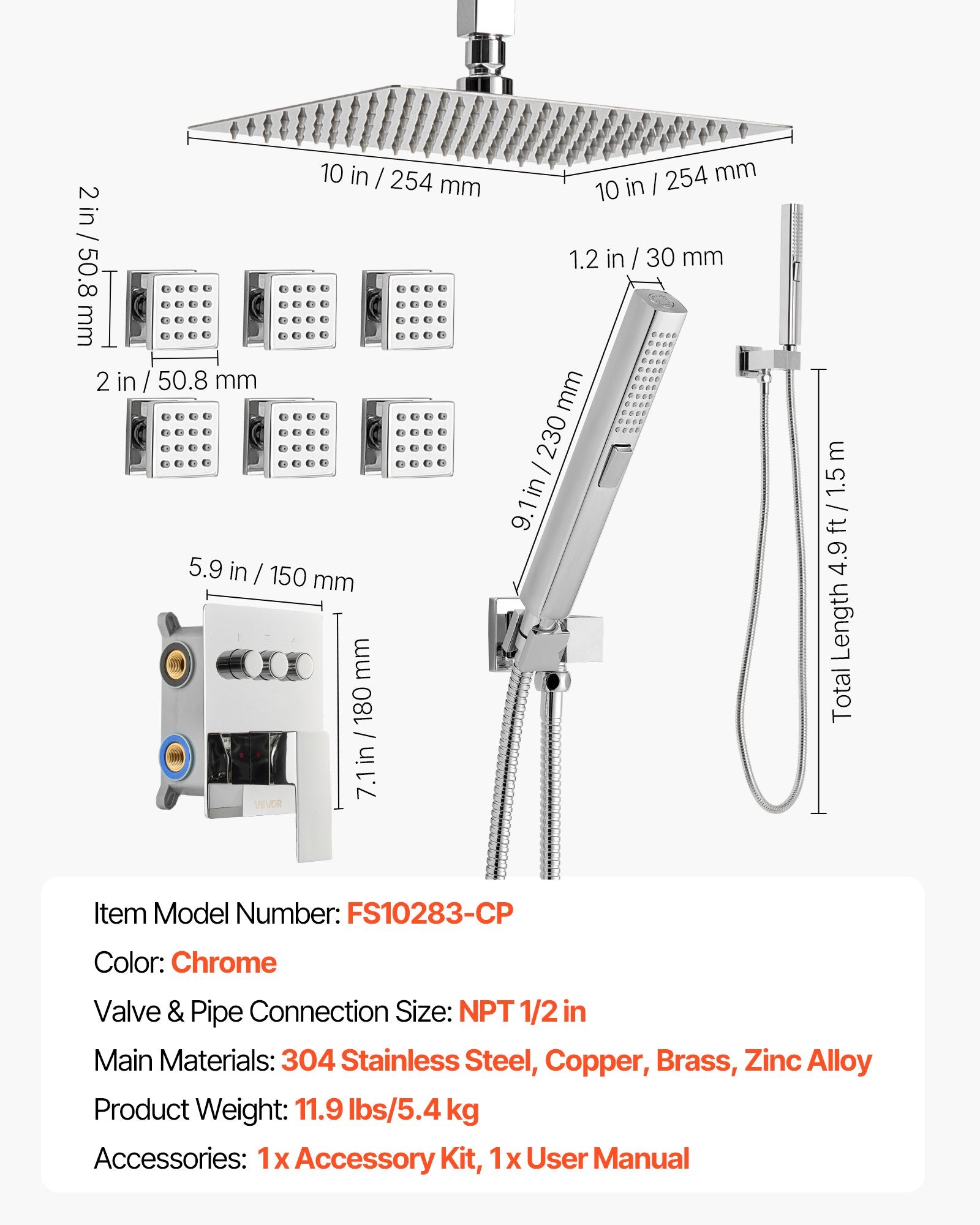 Shower Faucet Set, 10 Inch Ceiling Mount Rainfall Shower System with 6 Body Jets and 2 in 1 Handheld Spray, Rotatable 3-Function Rain Head System Set, Complete Brass Valve and Trim Kit, Chrome